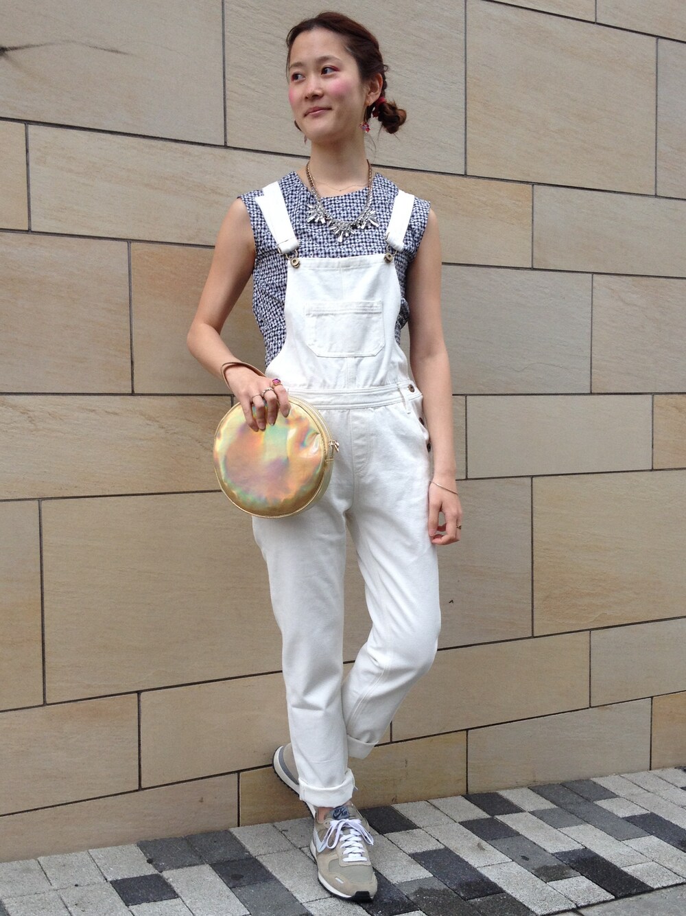ホワイトサロペットで爽やかに夏気分♪ 「rada」のビジューネックレスで、カジュアルになりすぎないようにしました。 トレンドのメタリックも取り入れて、完成!
