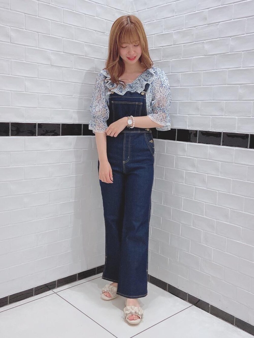 ブルーでまとめた夏っぽカジュアルコーデ✩スッキリシルエットのサロペットはかたすぎない生地で動きやすさ◎ブラウスは全体的に透け感があるので通気性よく涼しく着れます❤︎全体をブルーでまとめるとより涼しげな印象に見えますよね♪