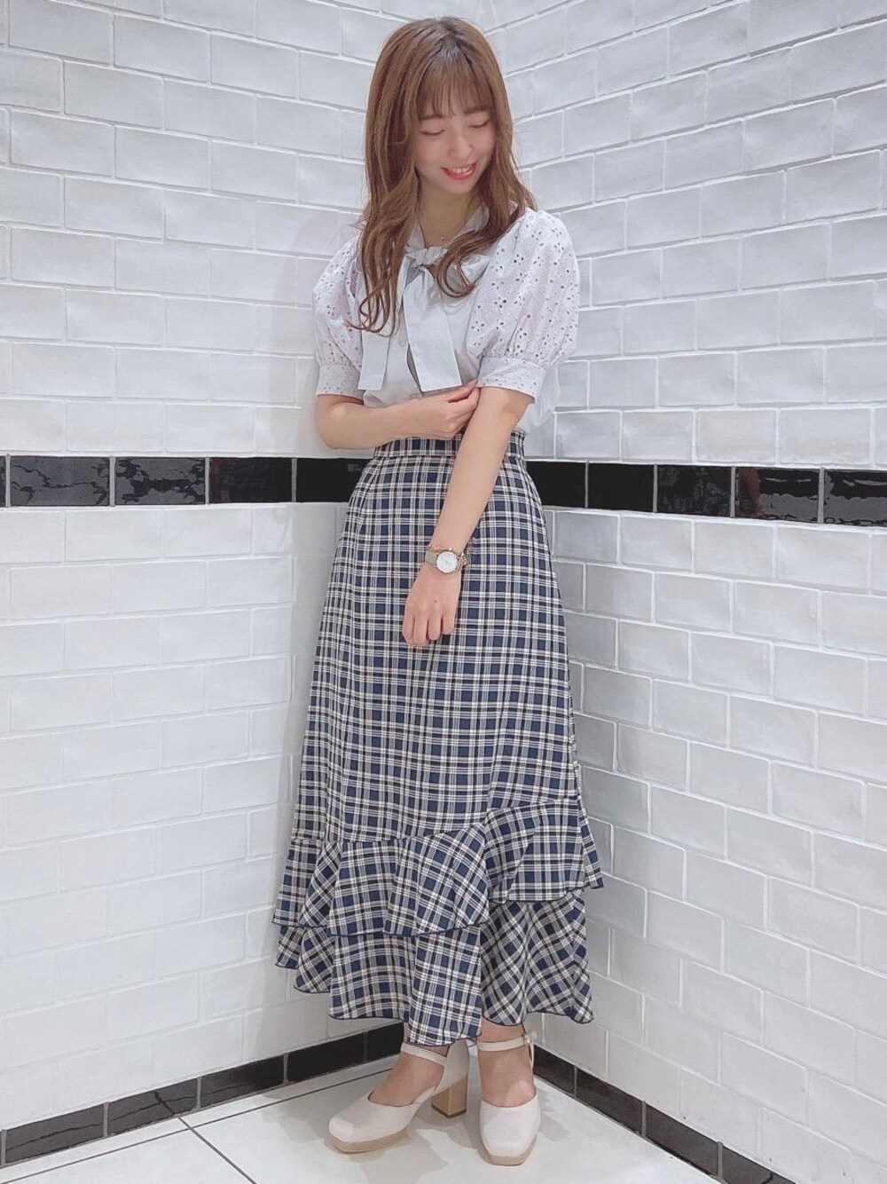るんのパンプス「ウッドヒールスクエアパンプス」を使ったコーディネート