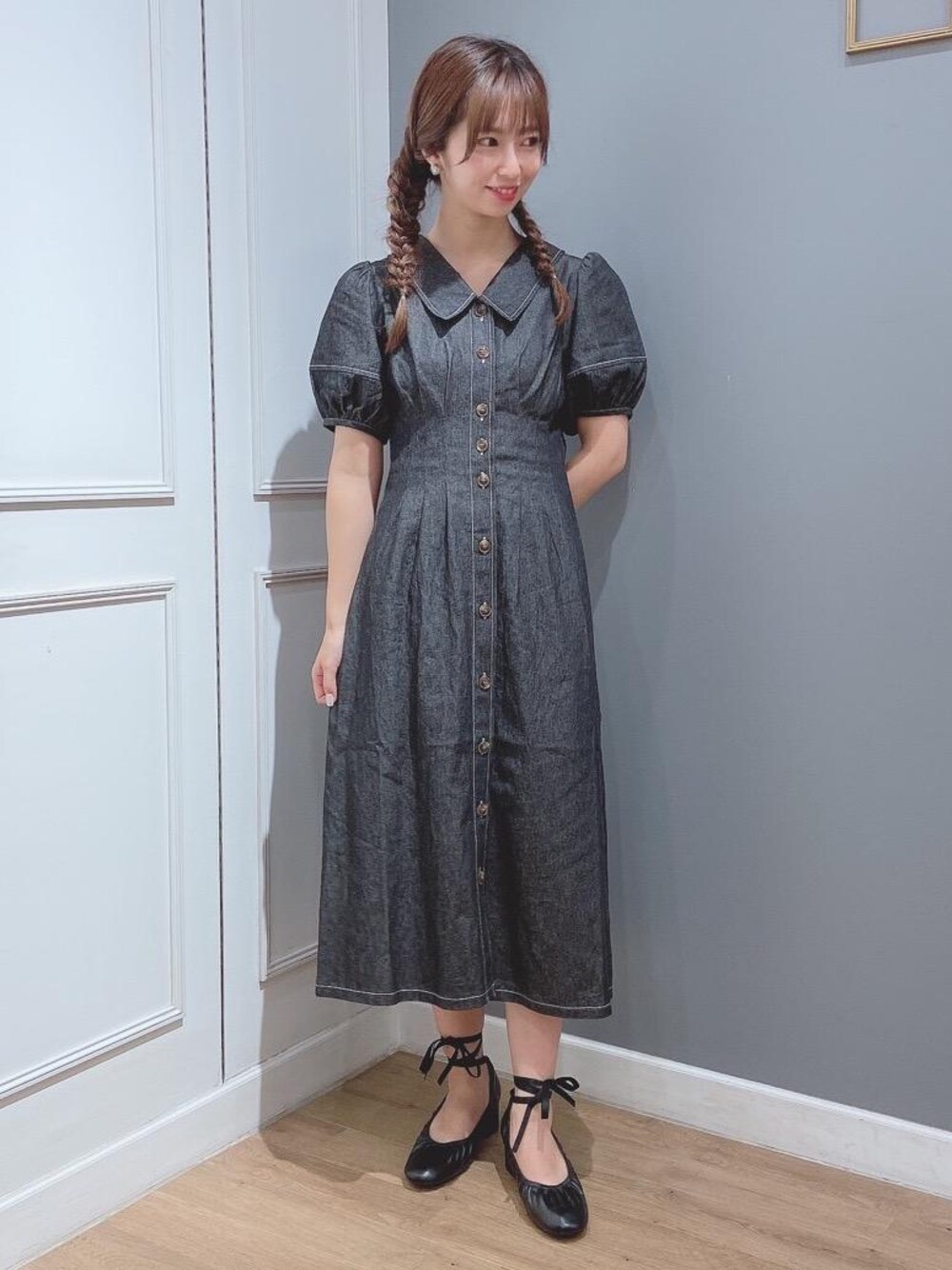 シルエットが綺麗な新作ワンピース✨着るだけでウエスト部分が細見えします◎デニム生地ですが、厚すぎないので夏でも着れる生地感♡これから秋まで大活躍間違いなし😉✨
