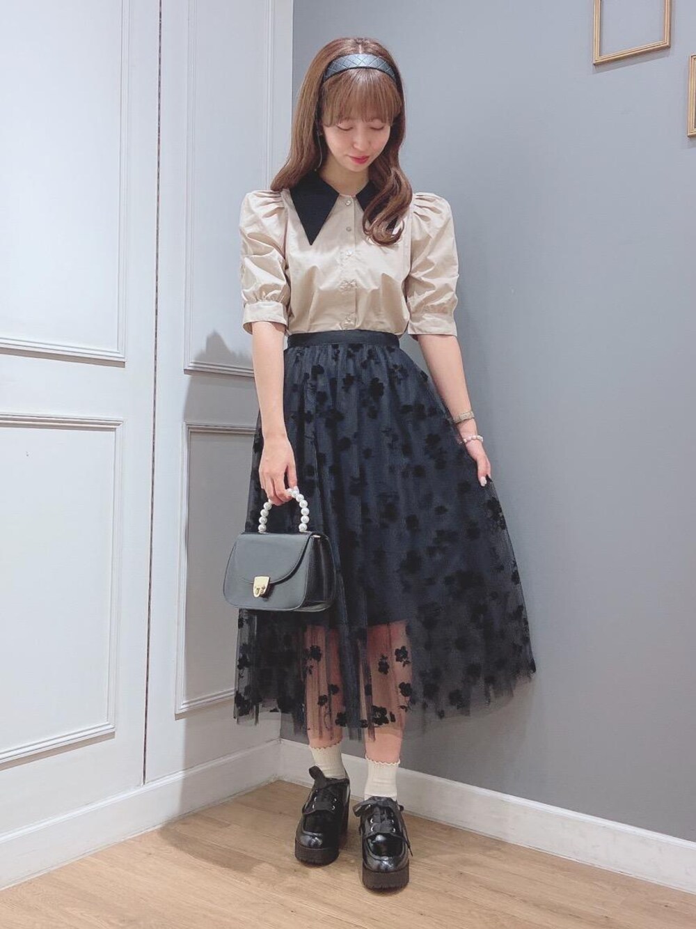 るんのスカート「フロッキー花柄チュールスカート」を使ったコーディネート