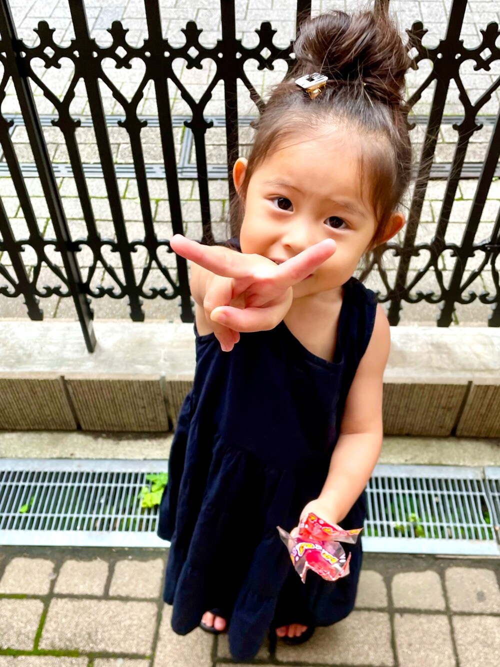 ティアードワンピース🌼 ロングのワンピースって転ぶと危ないかな〜ってなかなか着せないけど、やっぱり可愛い❤️ お団子ヘアーにして、スッキリ🌼