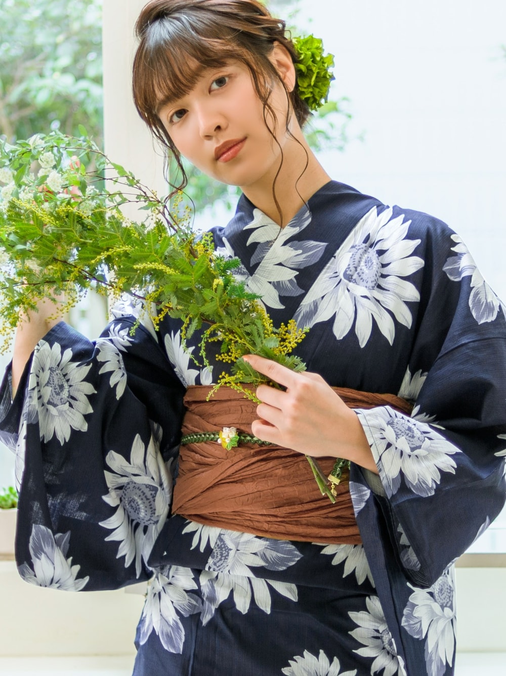 Ditaの浴衣「1人で着られる浴衣5点セット 和歌山染工日本染め(ゆかた・しわへこ帯・下駄・着付け本・腰ひも)【K】」を使ったコーディネート