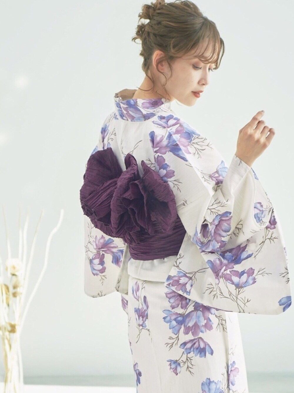 夏のデートはDitaの浴衣で♡ 《 1人で簡単着付け♪ 》 浴衣・しわ兵児帯・下駄・着付け説明本・腰ひも1本 届いてすぐに出かけられる合計5点セットです。 ■和歌山染工株式会社 伝統ある技法で職人が染め上げ、風合いのある仕上がりを演出。 海外生産では出せない国内染めならではの染め上がりです。 生地は”滝流れ織り”を採用。しっかりした生地感と、通気性が抜群です。 ■書き下ろしのオリジナルデザイン 京都の老舗デザイナーと何度も打ち合わせをし、 一年越しに完成した完全手書きの当店別注柄。 ここでしか手に入らない少量生産なので、人と被りません。 ”大人可愛い”をイメージした上品な仕上がりに。