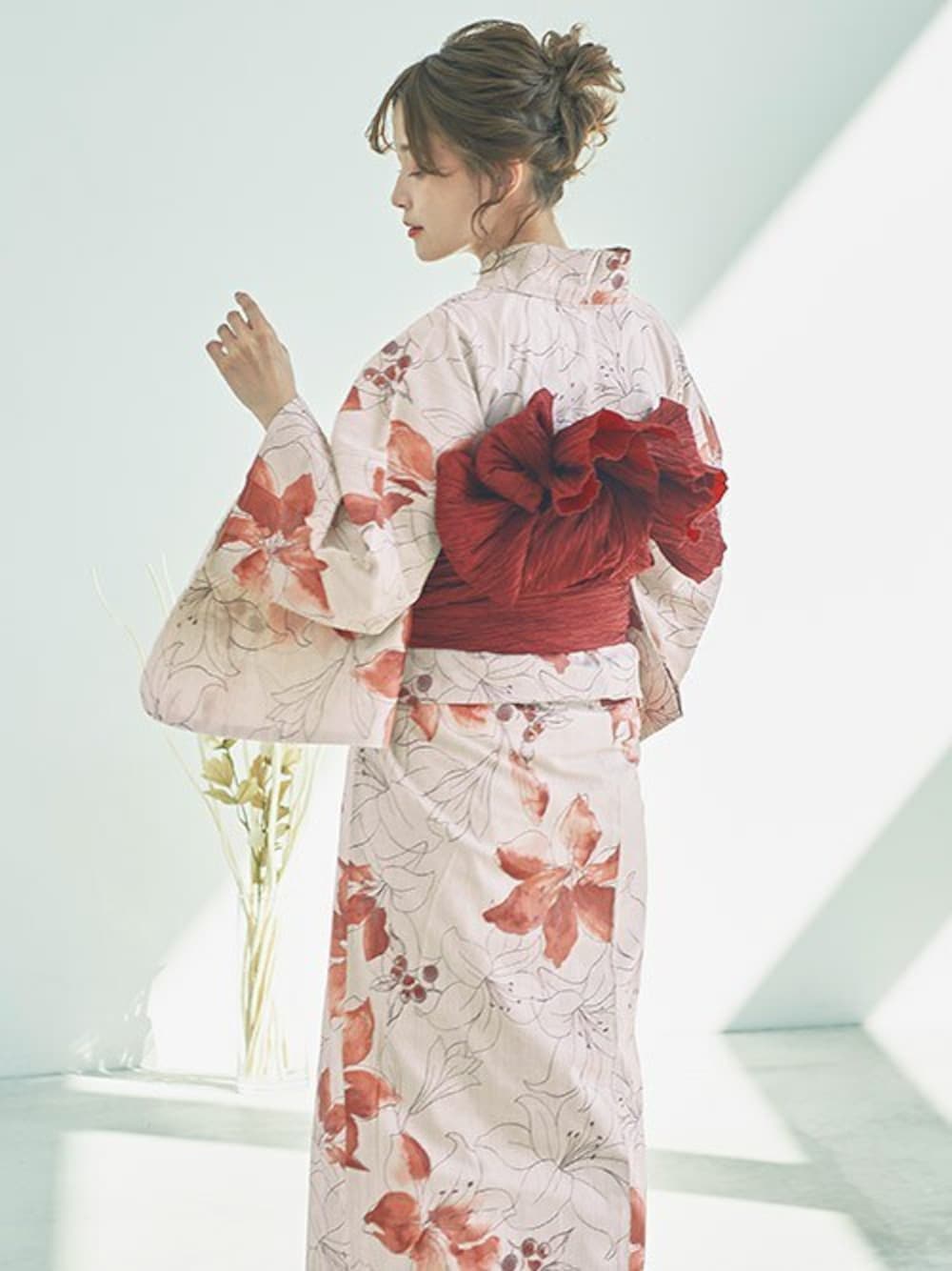 Ditaの浴衣「1人で着られる浴衣5点セット 和歌山染工日本染め(ゆかた・しわへこ帯・下駄・着付け本・腰ひも)【K】」を使ったコーディネート