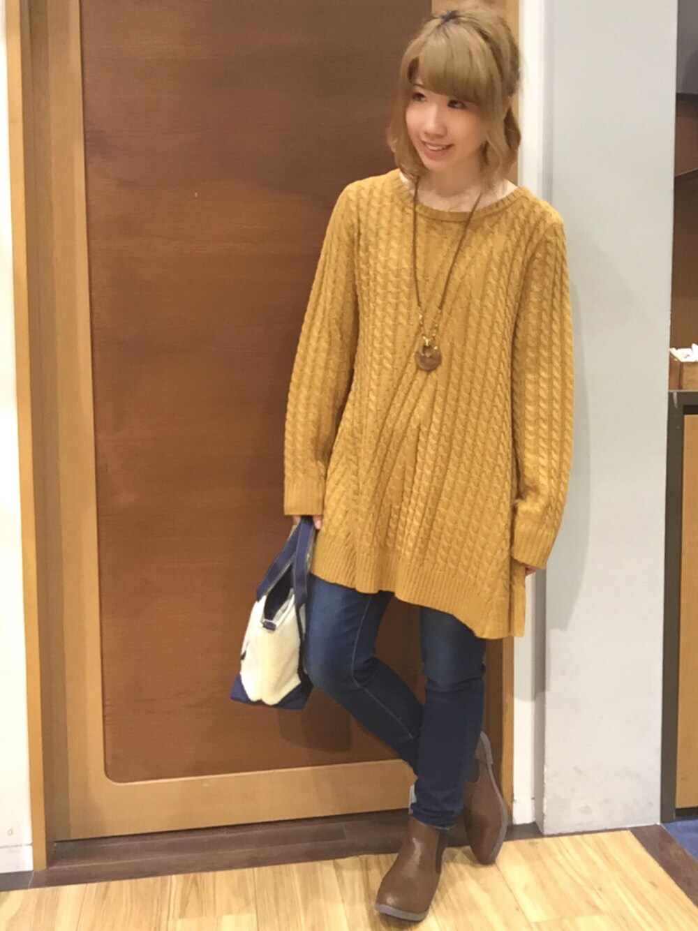 閲覧ありがとうございます! マスタードは秋冬着たいカラーですよね。 チュニック丈が嬉しいニットは裾もふんわり、袖も長めでかわいいです( ^u^ ) デニムと合わせてシンプルに!