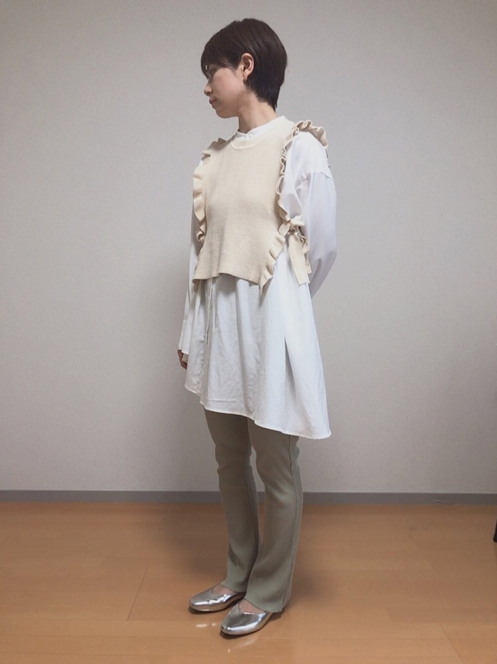 シルバーのVカットパンプスは幅もあり履きやすくてオススメ☆ さらさらのリブカットパンツは4センチほどセルフカットしてます! 気温が微妙な時期はニットベストが活躍します!