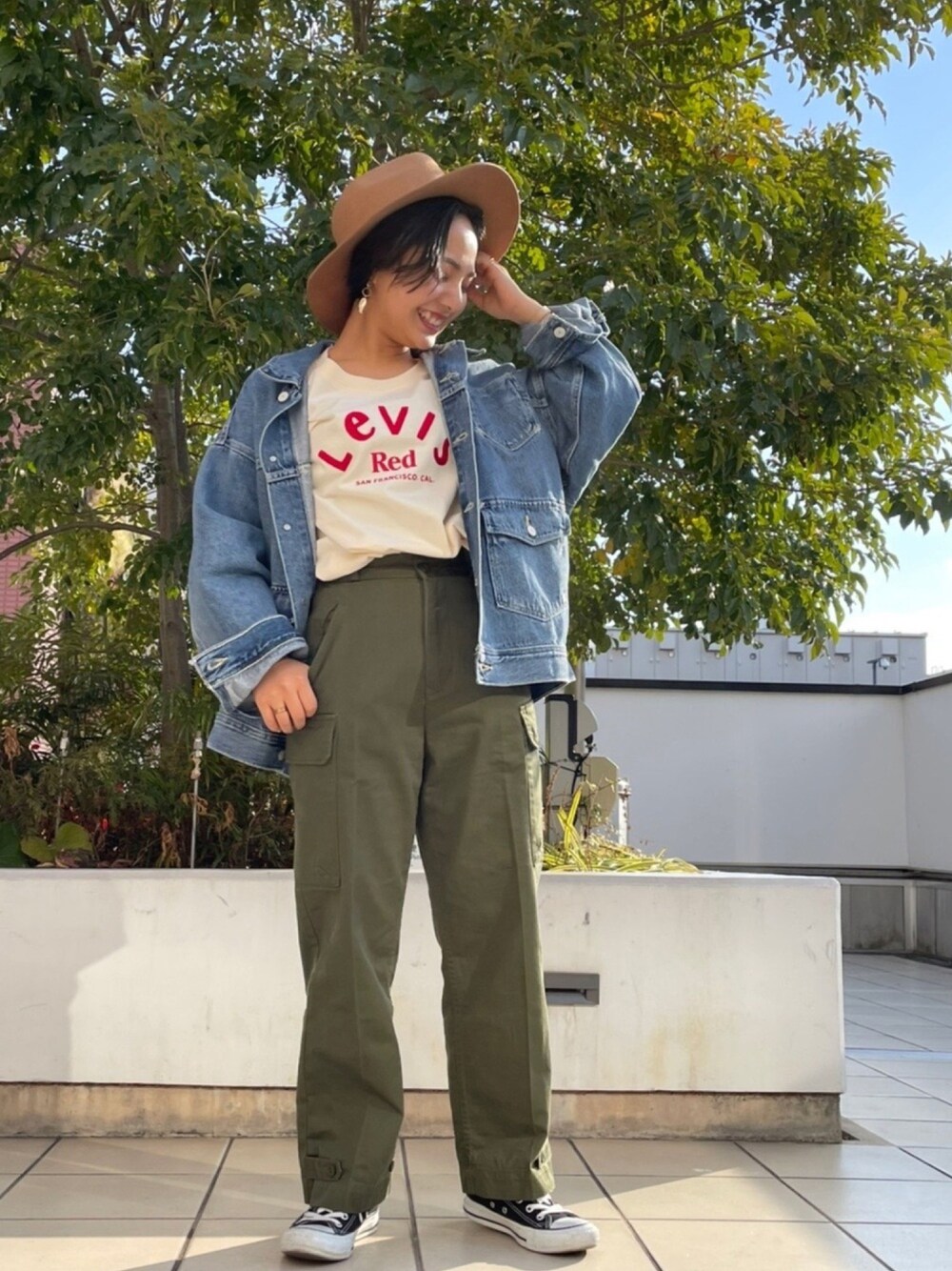 Levi's Redを使ったコーデです❤ 春はやっぱりデニムジャケット!!あえてボトムスもゆったりめのカーゴパンツでアメカジっぽくまとめてみました🇺🇸
