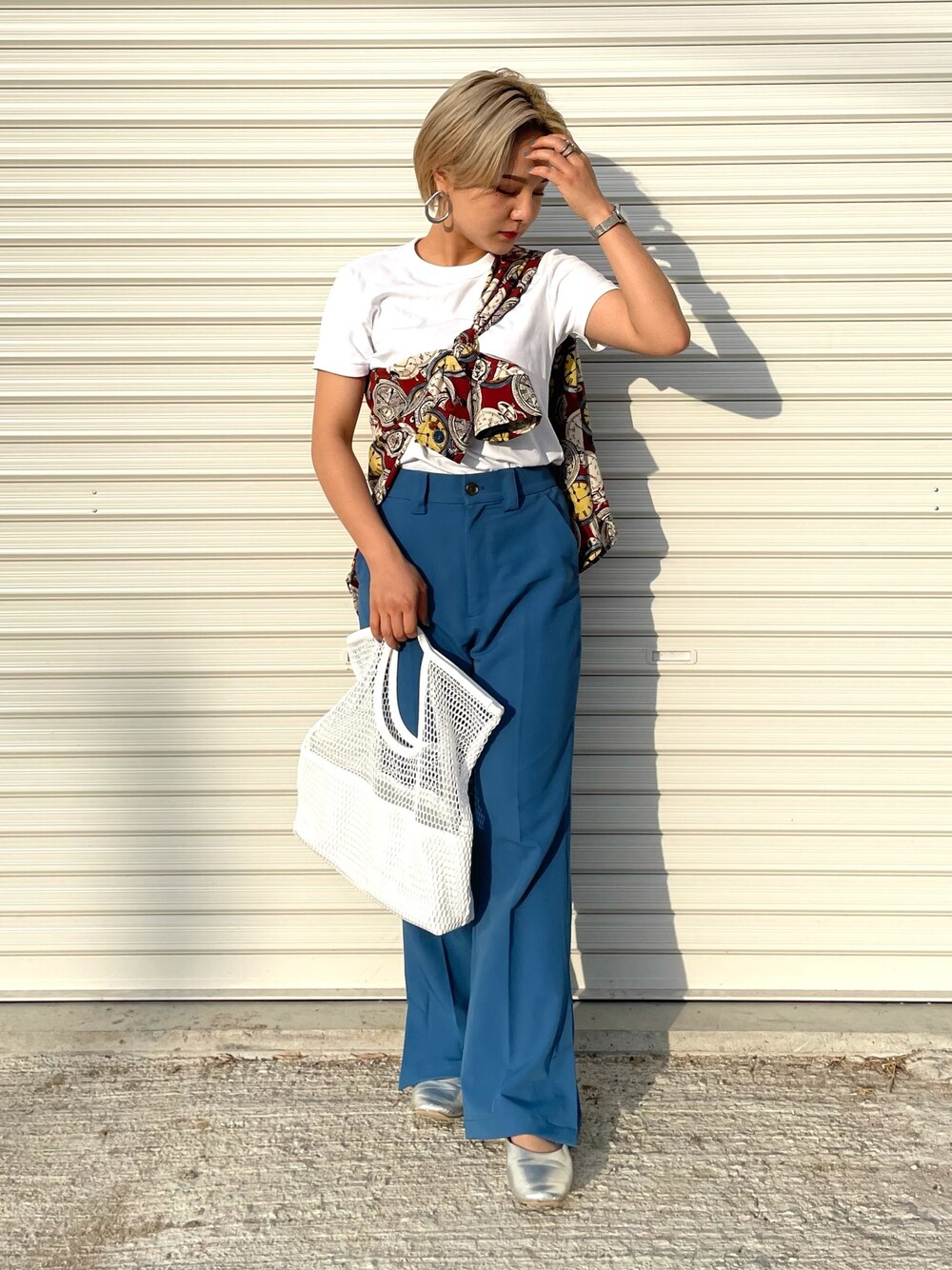 MariNaのスラックス「ドライギャバスリットカラーフレアパンツ」を使ったコーディネート