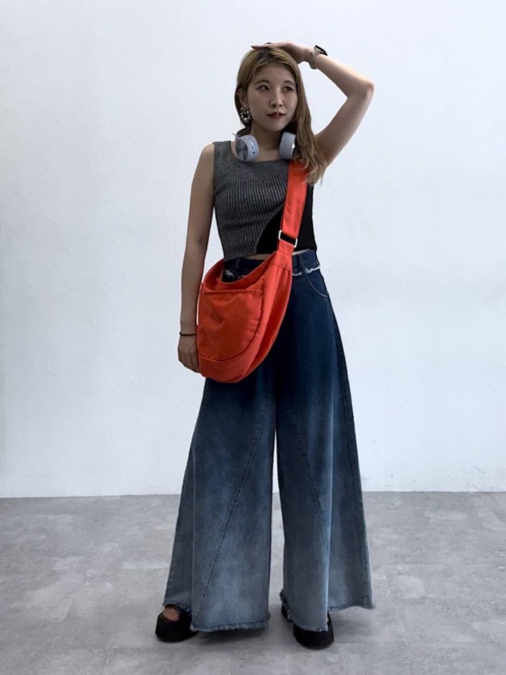 【楽チン!夏コーデ☀️】 タンク×デニムという王道スタイル♡ ボトムスのワイド感が他にはないシルエットで、 細かいところにフリンジやグラデーションと ポイントあるのがかわいい🤍 差し色でカラー入れると夏っぽくなるー!