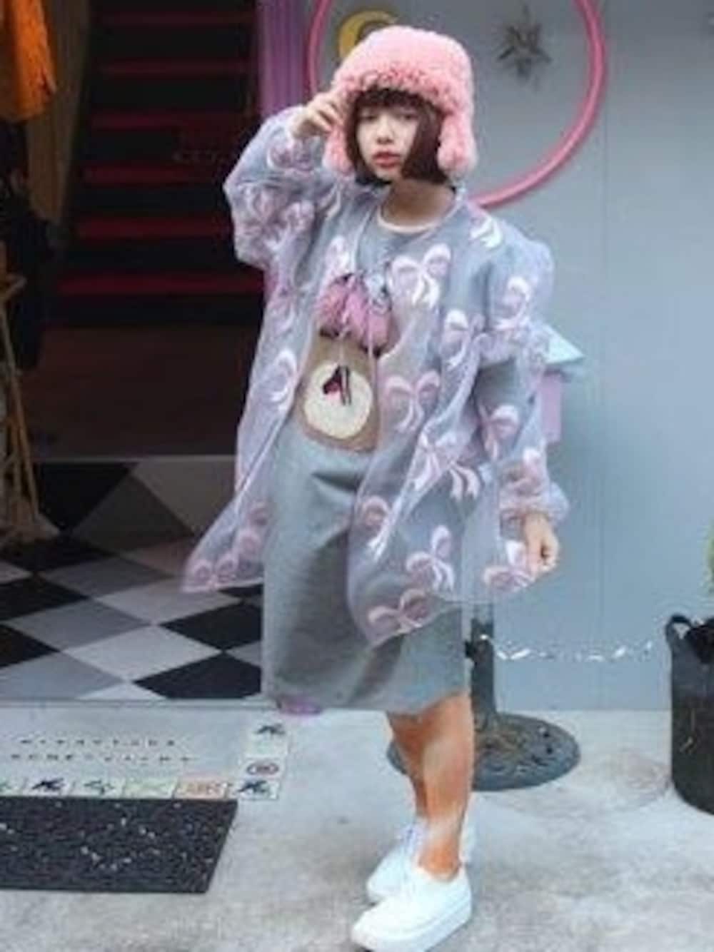 クマ子ワンピース🔜L'enfantillage アウター🔜MIKIO SAKABE フランスパンタイツ🔜ワンピースとタイツ シューズ🔜Tokyo bopper ラビット帽🔜あちゃちゅむ