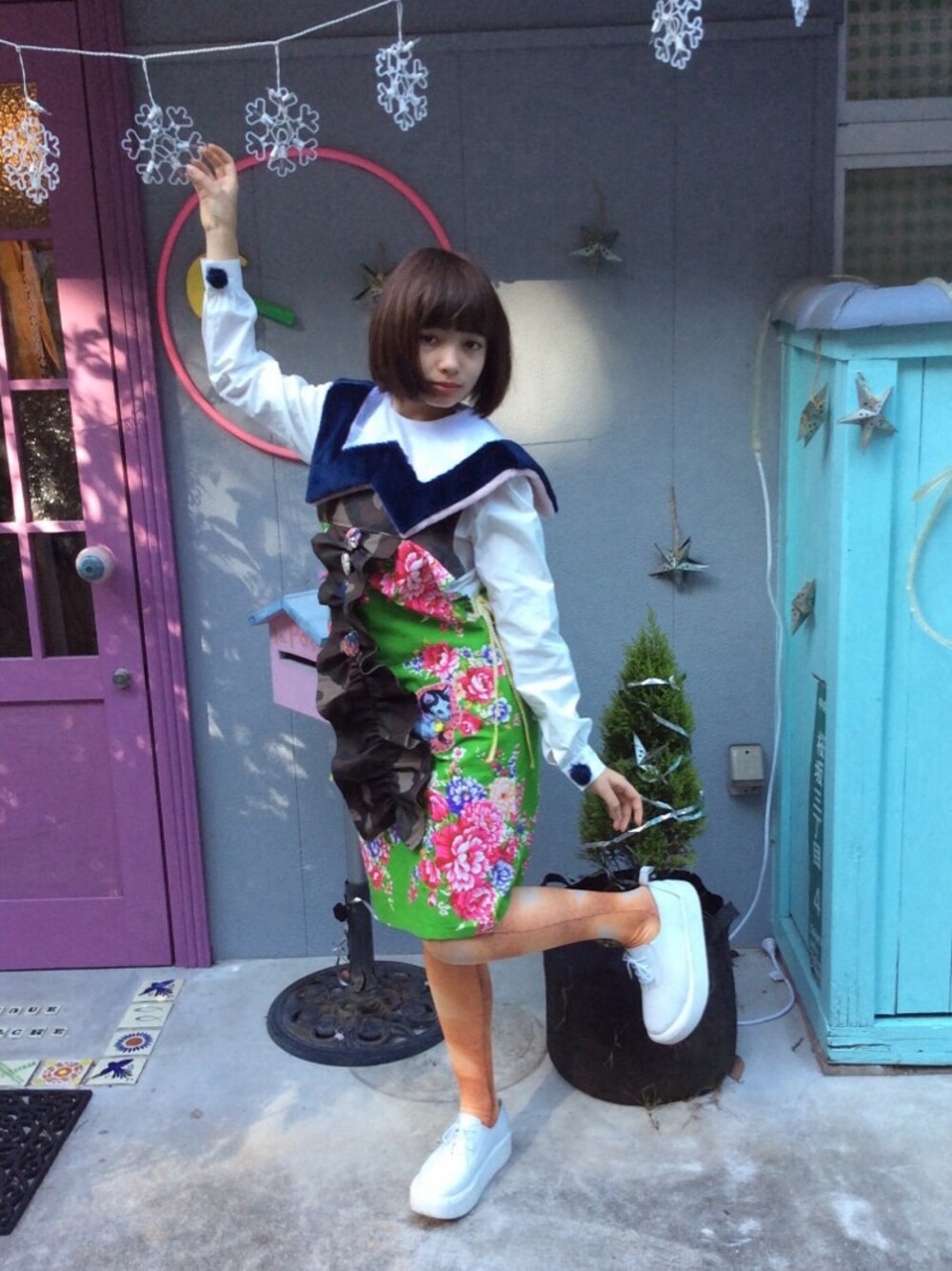 ヴィンテージ生地を使ったワンピース🔜L'enfantillage ブラウス 🔜Jenny fax フランスパンタイツ 🔜ワンピースとタイツ シューズ 🔜Tokyo bopper