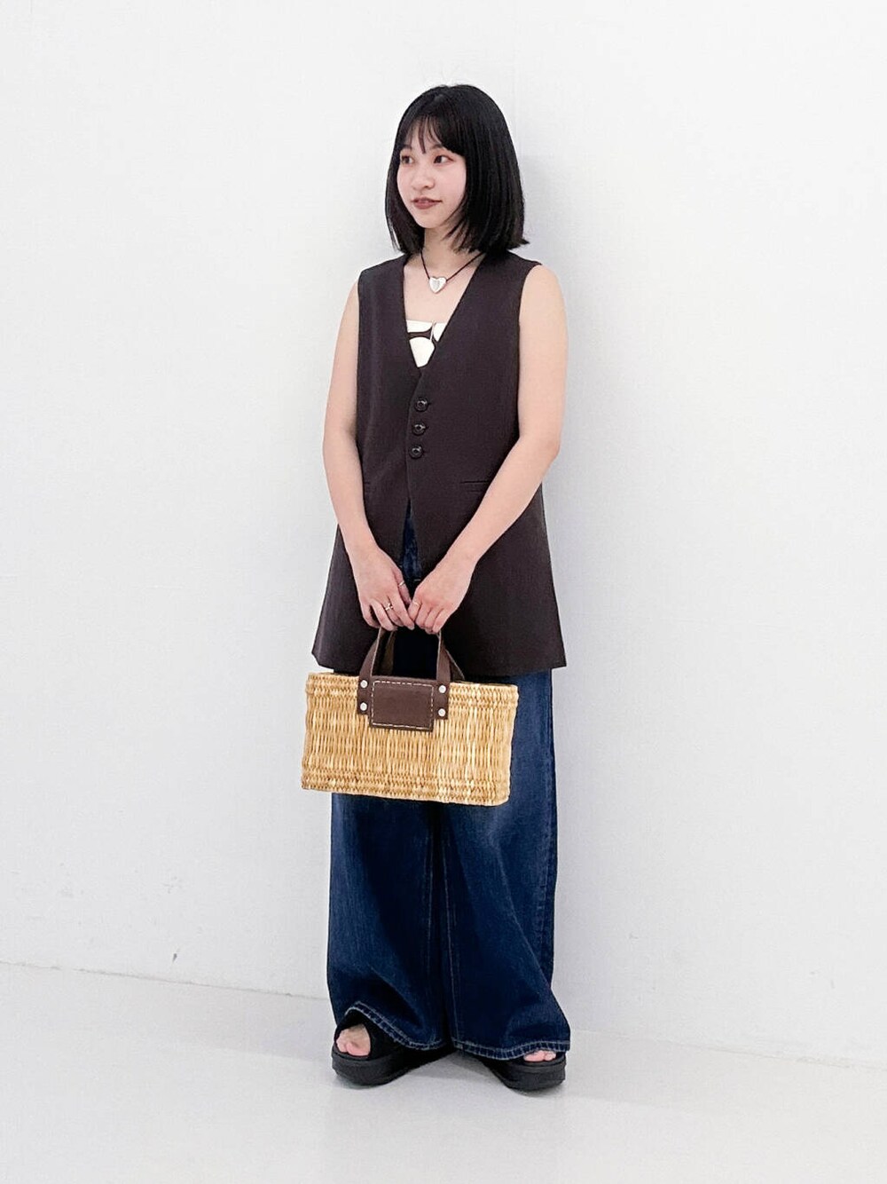 56cm | 👚S〜M | 👖S〜M | 👣23〜23.5cm | 骨格ウェーブ 前回着用のスイム2WAYブラを普段着として着用してみました✔️ チラッと見えるオリジナルプリントがコーディネートのポイントに..✨ ジレはノーカラーでスッキリしていて、綿麻素材なので 綺麗めなスラックスや、カジュアルなデニムまで… 幅広いコーディネートを楽しんでいただけます♫ Lee101別注のデニムはMサイズ着用。 丈感が長めだったため、厚めのサンダルと合わせました◎ ぜひご覧ください♡