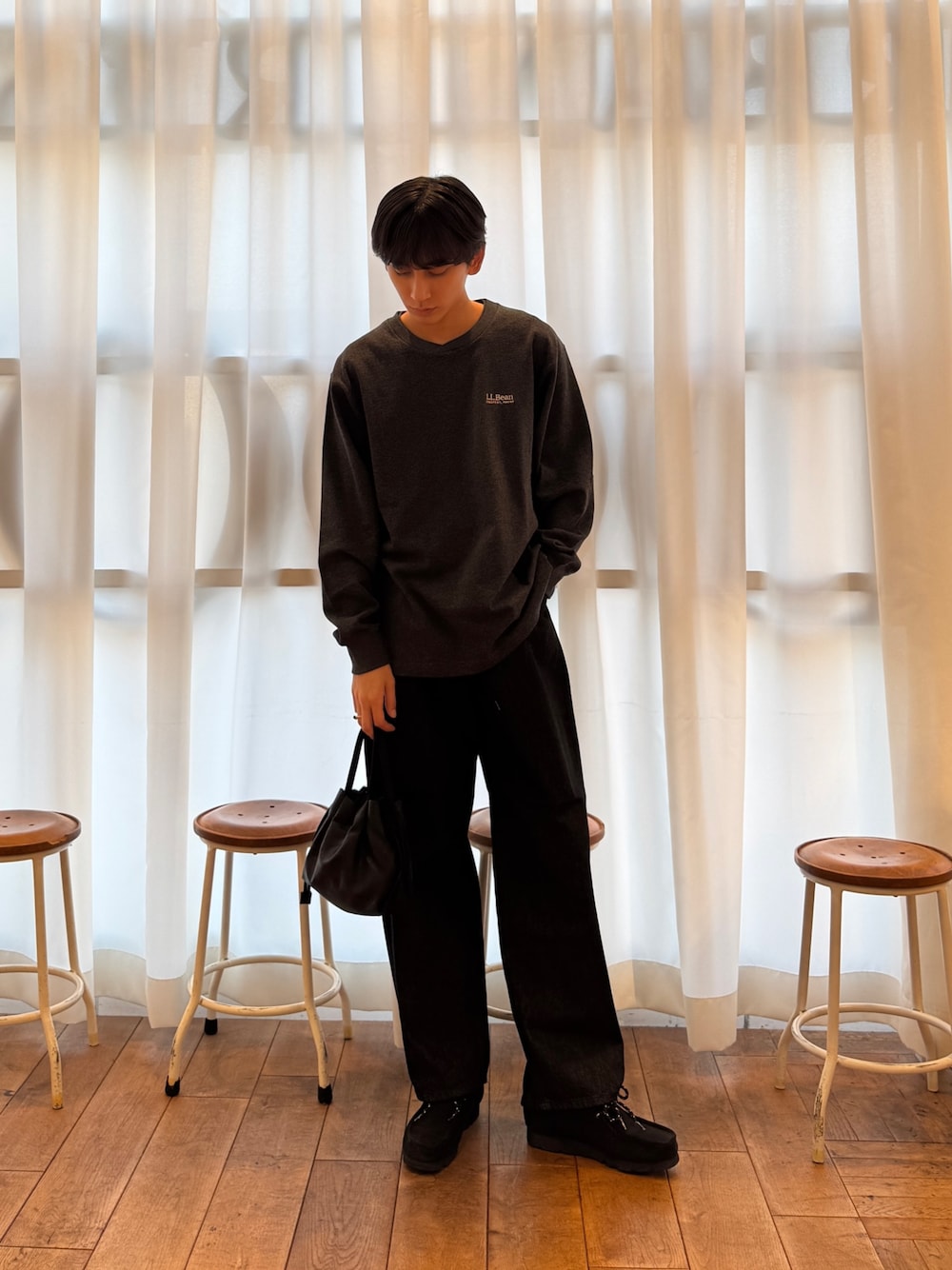 ご覧いただきありがとうございます^^ L.L.BeanのロンTとLee101カウボーイパンツを着用した、秋のキレイめスタイリングです✨️ オールブラックで統一し、よりカッコよくスタイリッシュに‼️ レディースのバッグも使用してみました^^ ぜひお試しください✨️
