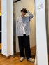 ご覧いただきありがとうございます^^ トップスはstill by handのブルーストライプのシャツで、サイズ46で177cm細身では、ジャスト~ややゆとりのあるサイズ感になります✔︎︎︎︎ パンツはEKALのスウェットパンツで、Lサイズを着用し、あえて大きめに着用してルーズな印象にしています✨️ ブルー×ブラックの都会的な配色に、ナチュラルカラーのBIRKENSTOCKを合わせることで抜け感のある大人カジュアルを演出しています‼️ ぜひお試しください✨️