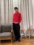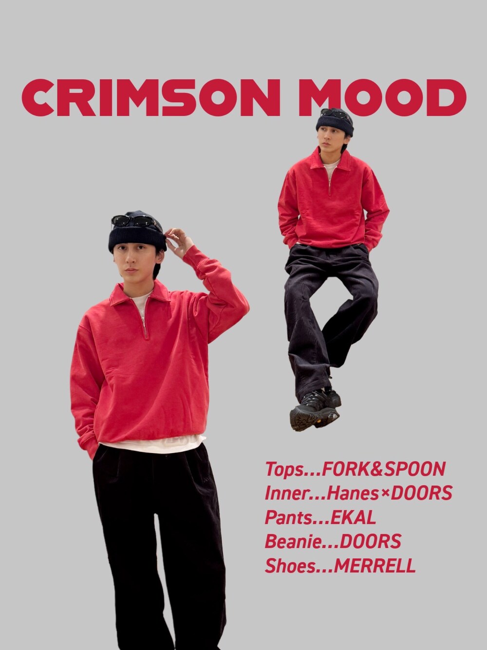 ご覧いただきありがとうございます^^ FORK&SPOONの新作ハーフジップスウェットを着用したスタイリングです✨️ 鮮やかな赤が、暗くなりがちな冬のスタイリングに華やかな印象を与えてくれます◎ トップスの赤をより映えさせるために、他のアイテムは全てシンプルで落ち着いた色を選んでます✔︎︎︎︎ トップスだけではなく、コートやダウンのインナーとしてもアクセントになります‼️ ぜひお試しください✨️