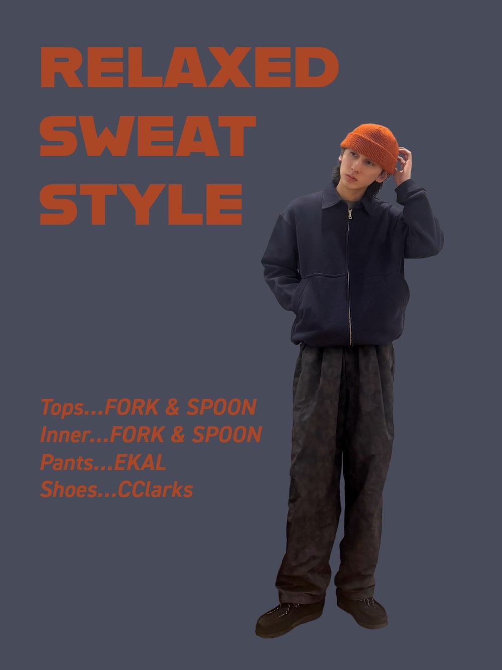 ご覧いただきありがとうございます^^ Imuイチオシのオレンジ×ネイビースタイル✨️ トップスのFORK & SPOONジップスウェットカーディガンは生地感がしっかりしていて着心地もバツグン‼️ 羽織としてもトップスとしても着用できる万能アイテムです◎ ラフスタイルがお好みの方はぜひお試しください✨️