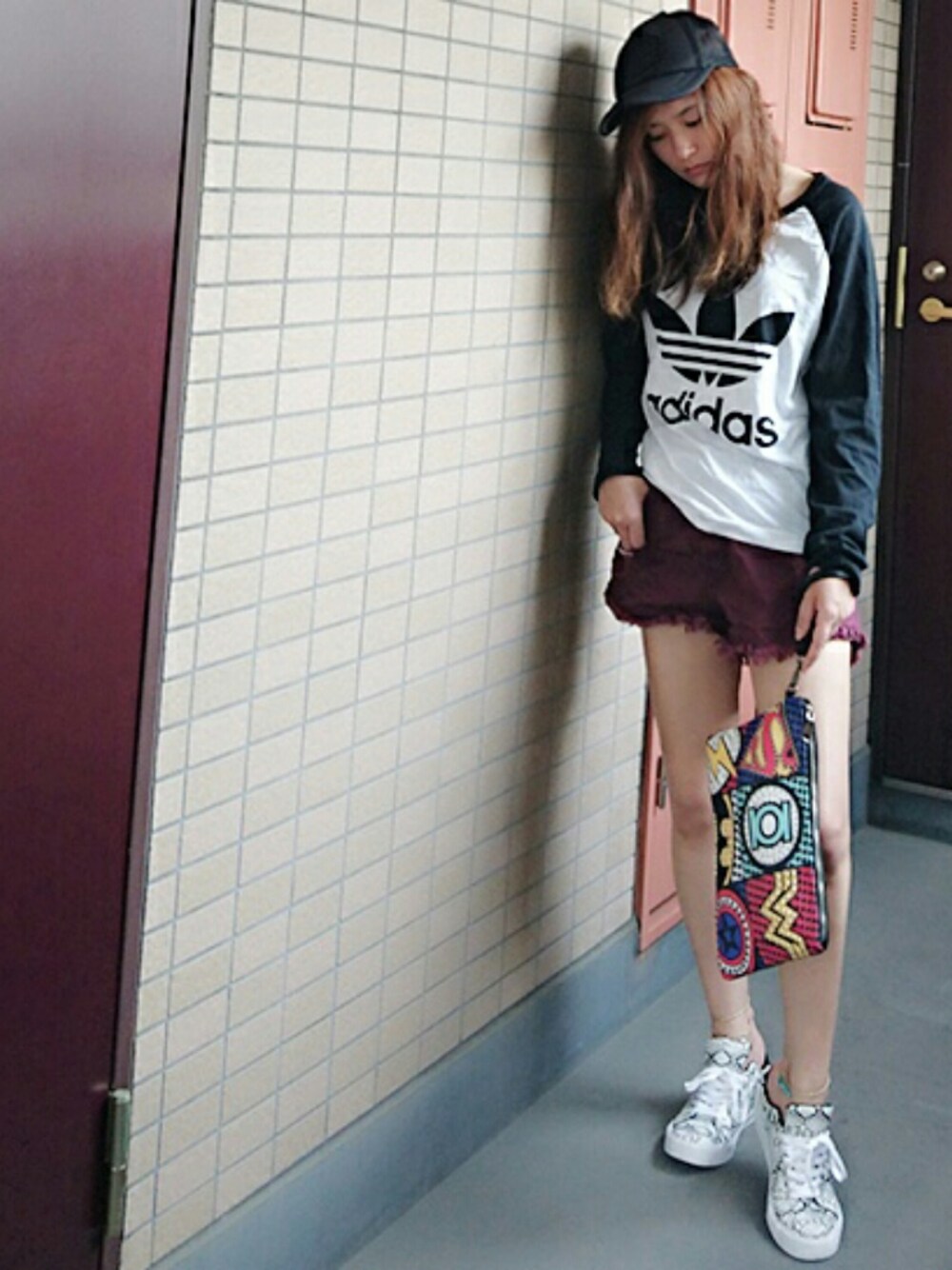 朝ぶらっとしにいっただけコーデ❤ アベンジャーズクラッチ700円くらい、 スニーカーはGU プチプラ~✨ insta→0v0ari