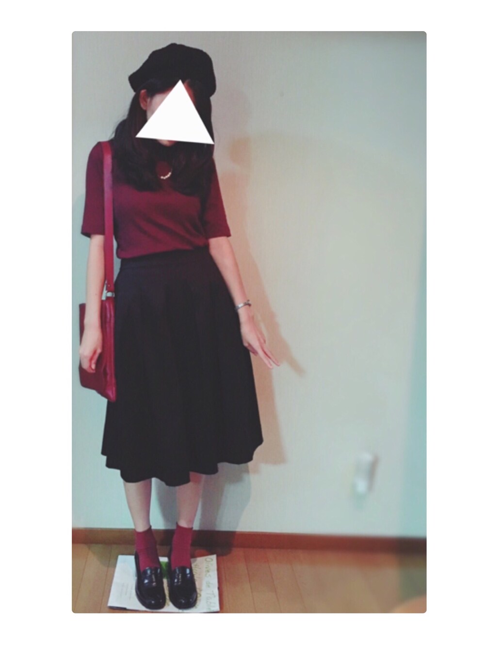 上下UNIQLOコーデ。 リブハイネックT 1080円 タックスカート 540円(セール価格) のプチプラ🙆 ローファーは高校時代に履いていたものを久しぶりに履きました。 ボルドー×ブラックで統一! ちょっとサンドウィッチみたいな統一感… ベレー帽気に入りすぎて毎日被ってます🙄 雨多くて髪の毛広がるのも抑えてくれるので😂