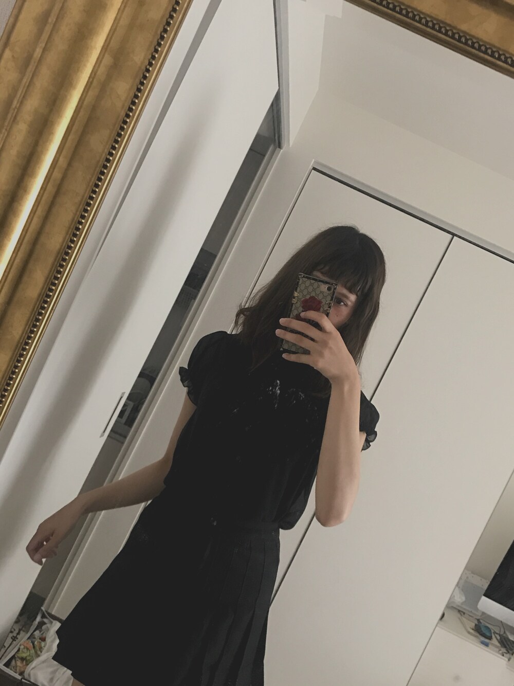 ブラック系のスカートを着用したレディースの夏コーディネートの1枚目の写真
