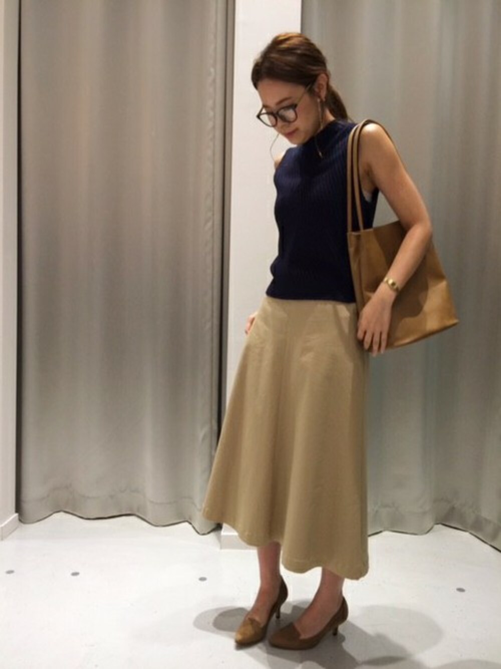こちらのセミフレアスカートは、先日ご紹介したワイドパンツと同じ綿カルゼ生地で肌触りがさらっと気持ちよく、夏から秋にかけて万能にお使い頂けます。 トップスはハイネックのノースリーブニットでスッキリ綺麗にまとめました。
