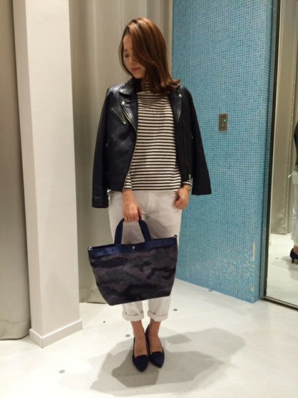 秋冬にあえて白のデニムをはき、トップスもホワイトのボーダー柄を合わせて クリーンな印象がかっこ良く大人のマリンコーデに仕上がりますよ。