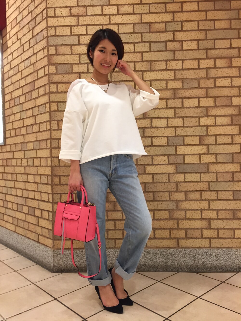 オーバーサイズのトップスをデニムにカジュアルに。オーガンジー素材とピンクのバックで春らしく♪