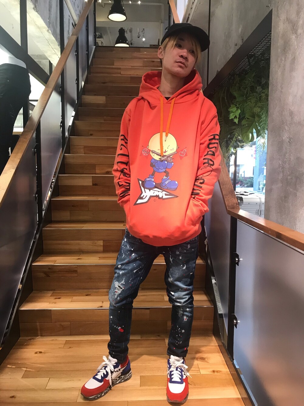 yoshiaki matsufujiのパーカー「【別注】20471120 × roarguns / トゥオーフォーセブンワンワントゥオー×ロアーガンズ /20SGB-RF1B/袖プリントフーディ」を使ったコーディネート