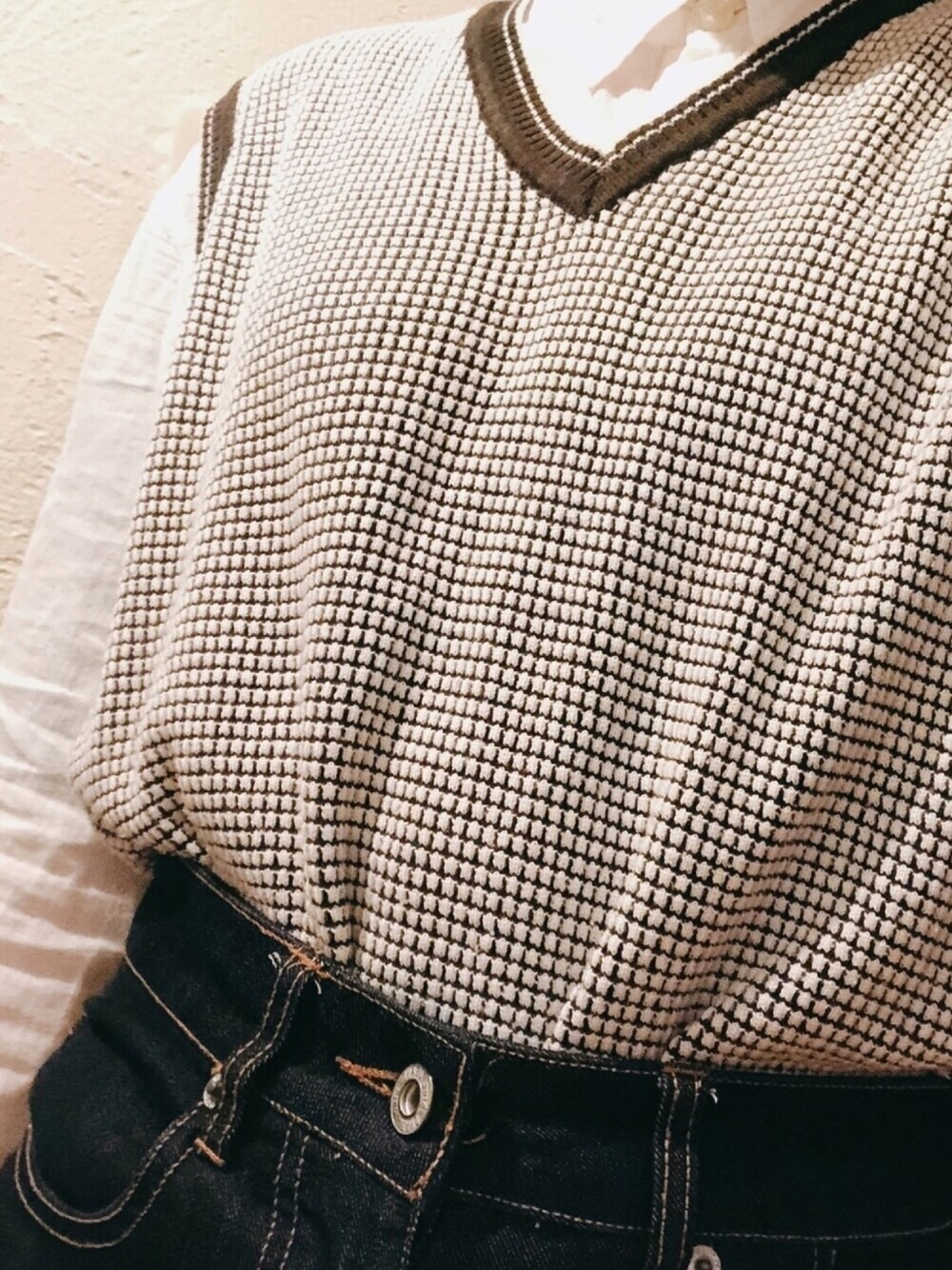 * お気に入りの黒っぽいデニム☺︎ . ベストはたまに目がチカチカするって言われます(笑) .