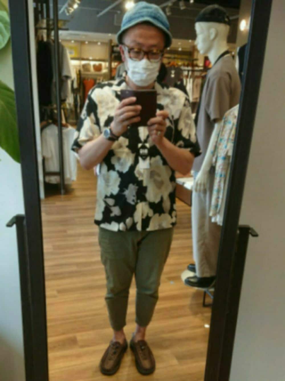アウトレットのBEAMSで、これからの暑い時期に備えてアロハシャツ的なものを買う前に試着。 Mサイズなのにボタンが閉まった、素晴らしい(笑)