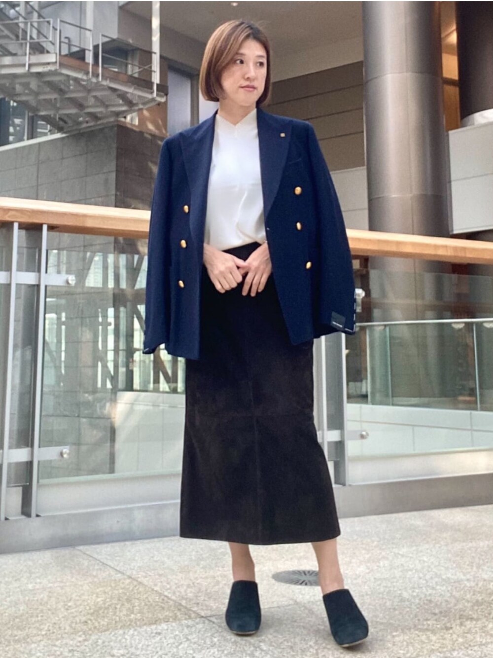 DESIGNWORKSのVネックニットはネックの開きが浅いのがポイントです!上品な印象になるので女性にもおすすめ。 ジャケットのインナーに入れても首元がスッキリするので程よく抜け感が出せますよ。