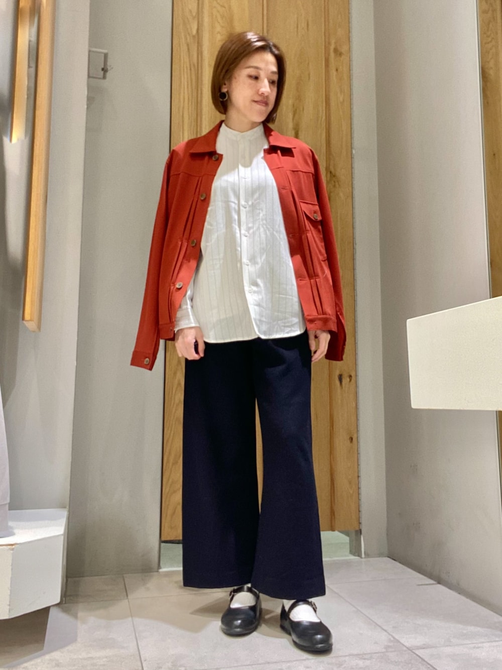 バンドカラーストライプシャツはサイズ44で着丈や袖丈も問題なく着れました。程よくゆとりのある身幅でとても着やすいシャツです。 ポンチブルゾンはあえてオレンジカラーをチョイス。意外と何にでも合います。