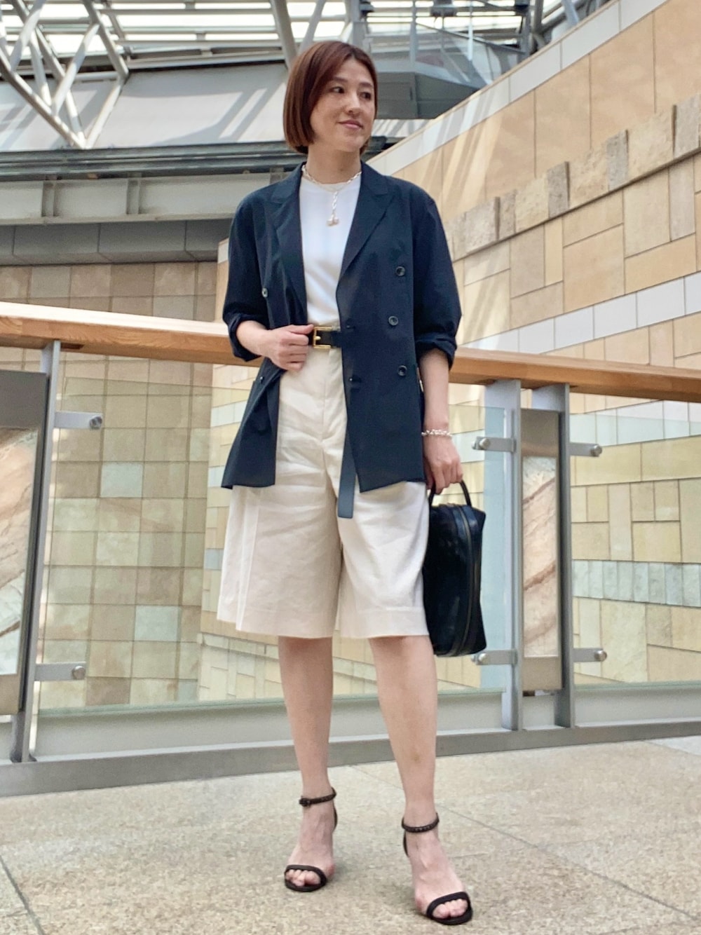 シアージャケットは程良い透け感が◎。 透けすぎないので上品に着こなせます。 ハーフパンツと合わせて大人の夏スタイル。 通勤にもおすすめのスタイリングです。