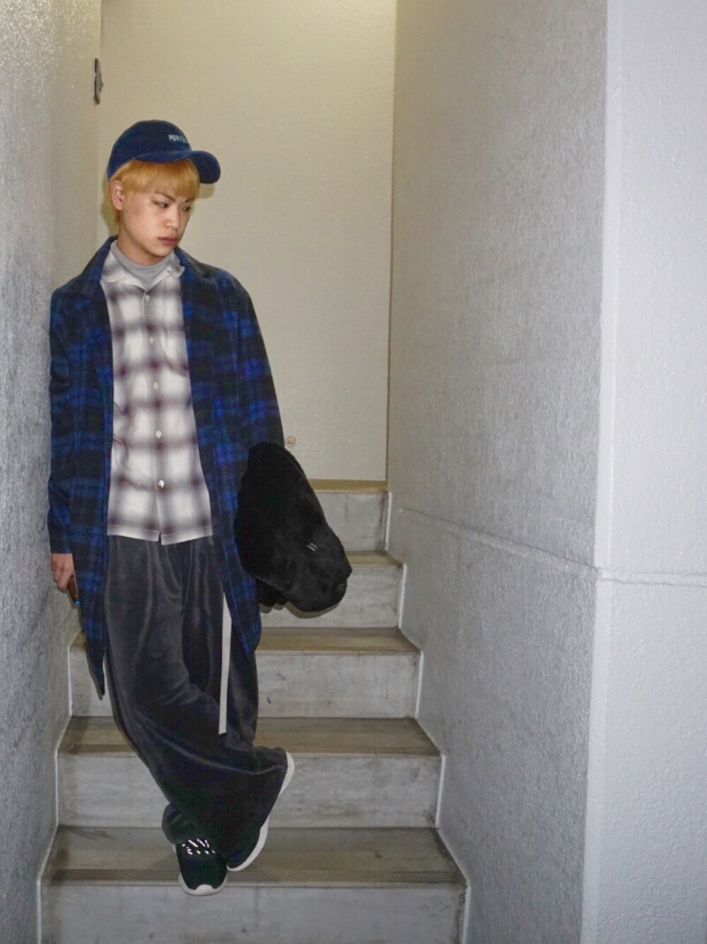 インナーとパンツは、グレー系でまとめて、アウターとキャップは青で差し色に(^ ^) チェックオンチェックで^ ^ チェックのデザインとサイズを気をつければ、 ごちゃごちゃにはならない🤩