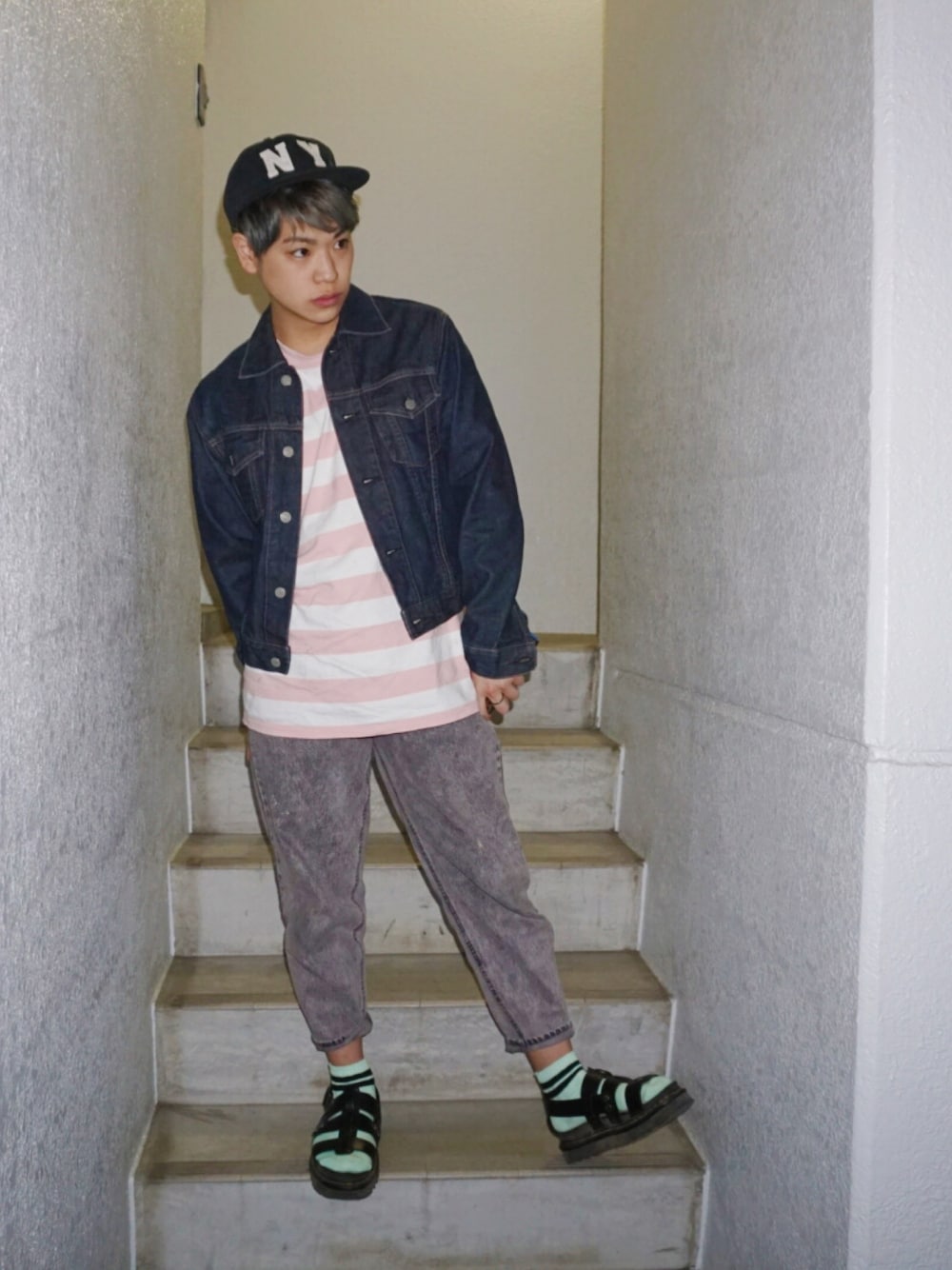 ピンクボーダーにピンク系デニムを合わせて、統一感を出したコーデ🌈