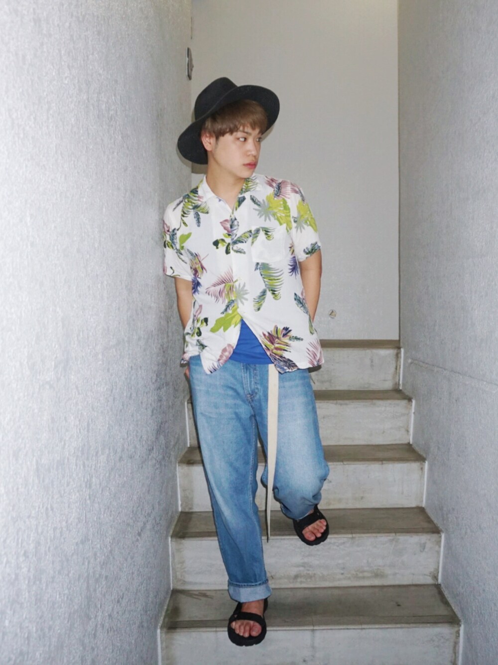 こんばんは^ ^✨✨ いつも見て下さってる方、 初めましての方、 見ていただきありがとうございます😚🌈🌈 今日は夏ぽっく! アロハシャツ🌺 トップスとデニムが明るい感じなので、黒の麦わら帽と黒のサンダルでぼやっとしないようしめた👍