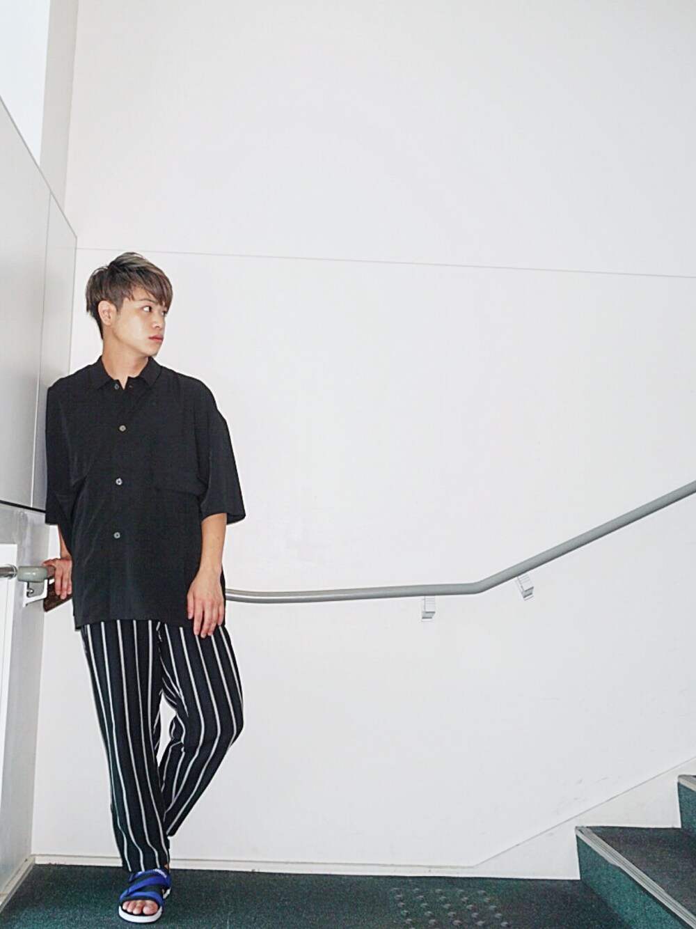 今日のコーデは、 黒でまとめてサンダルの青を差し入れ💙 昼間は本当に暑い(>人<;)
