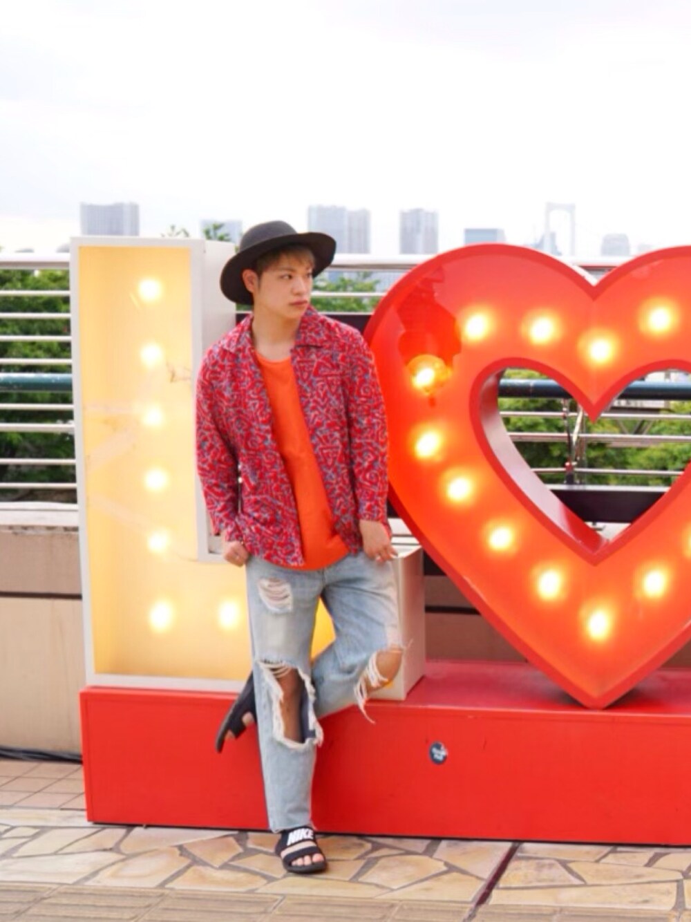 河崎良侑(りょう)のハット「WEGO/ツバ広ペーパーハット」を使ったコーディネート