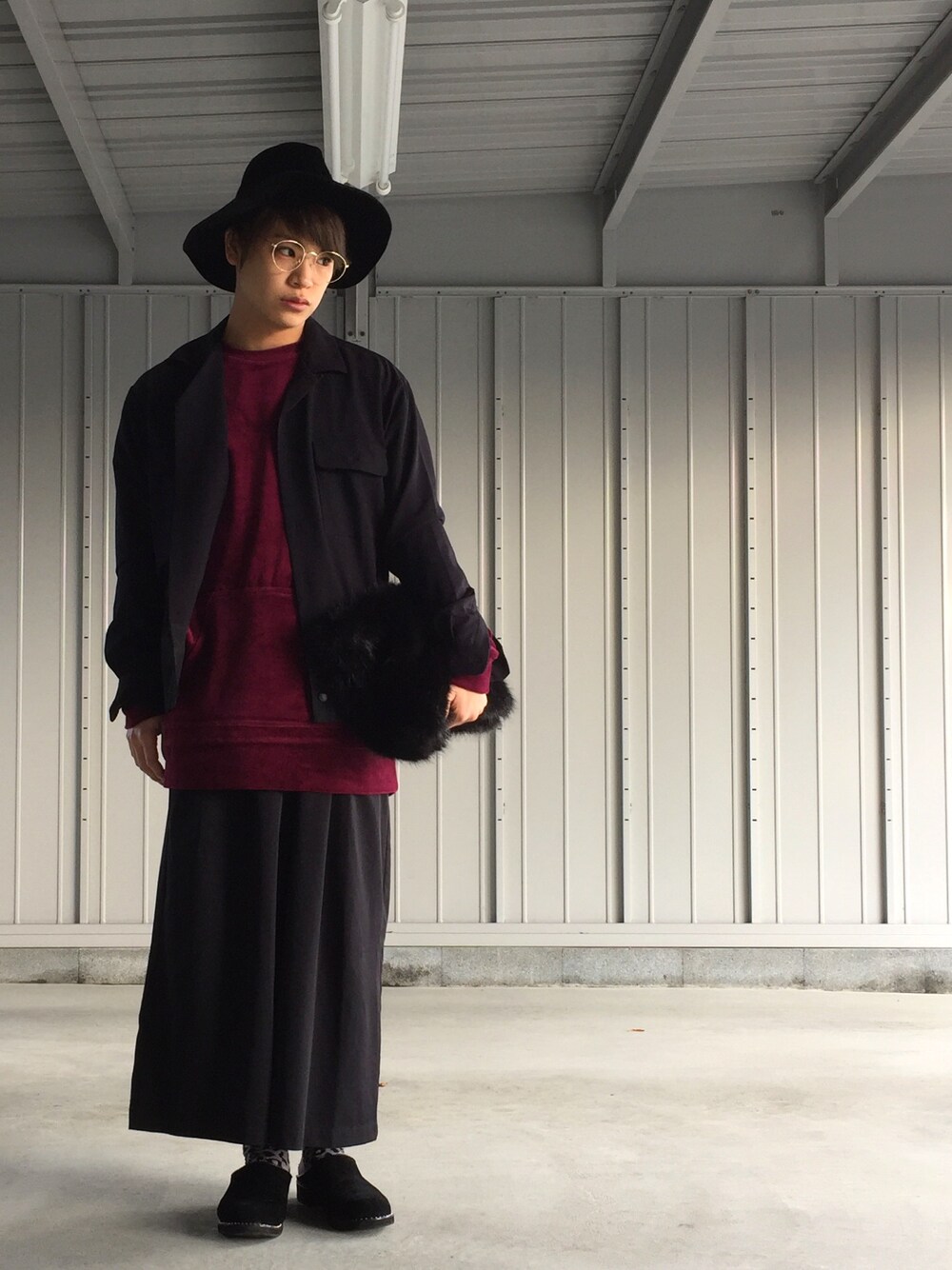 河崎良侑(りょう)のクラッチバッグ「フェイクファークラッチBAG」を使ったコーディネート