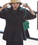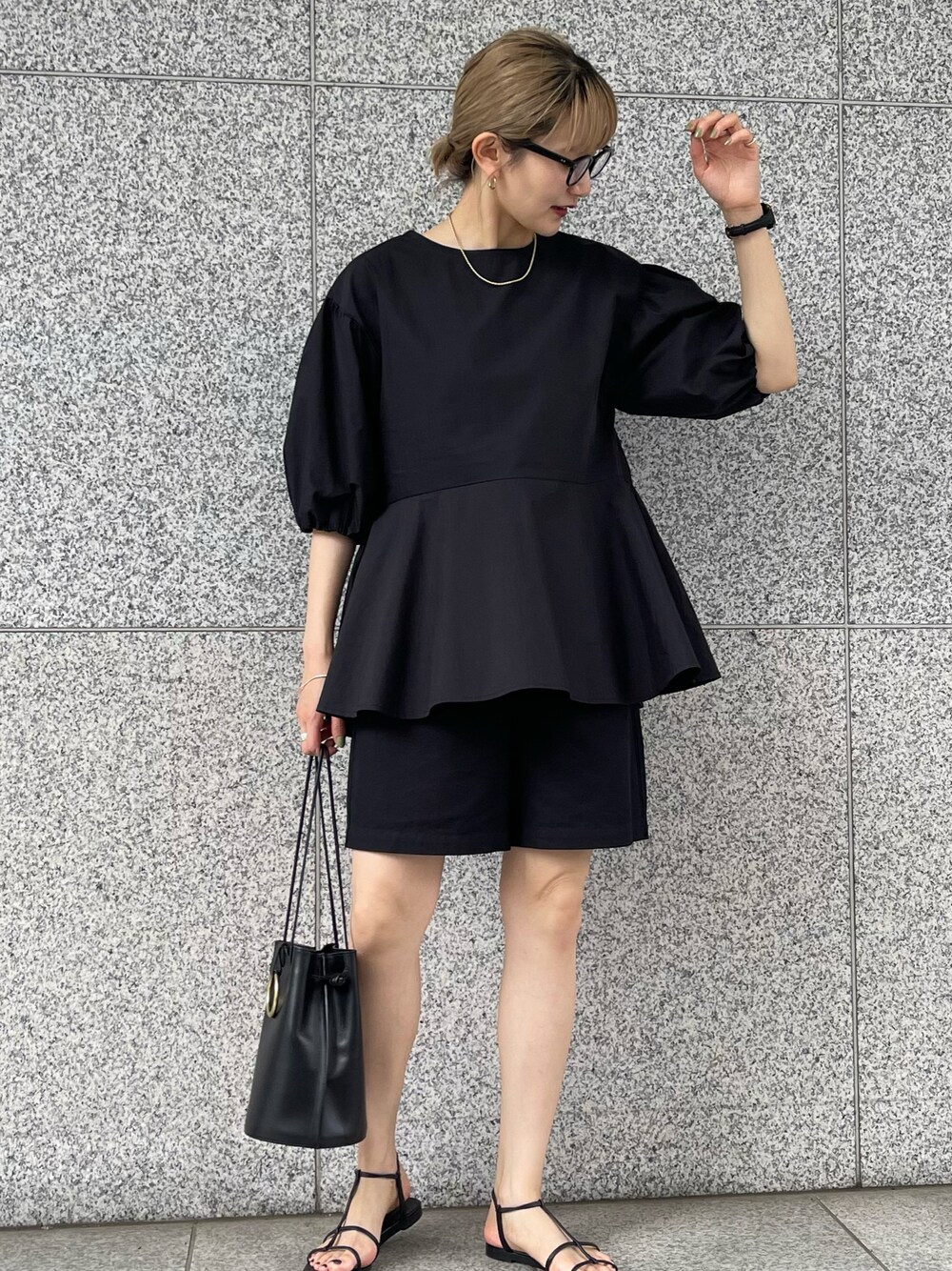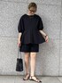 ブラックでワントーンな着こなしにしました。 ブラウスは前後差のあるデザインで、高めのウエスト切り替えでお腹周りやお尻、二の腕など隠したい場所を隠せる着痩せ抜群アイテムです!おすすめです!