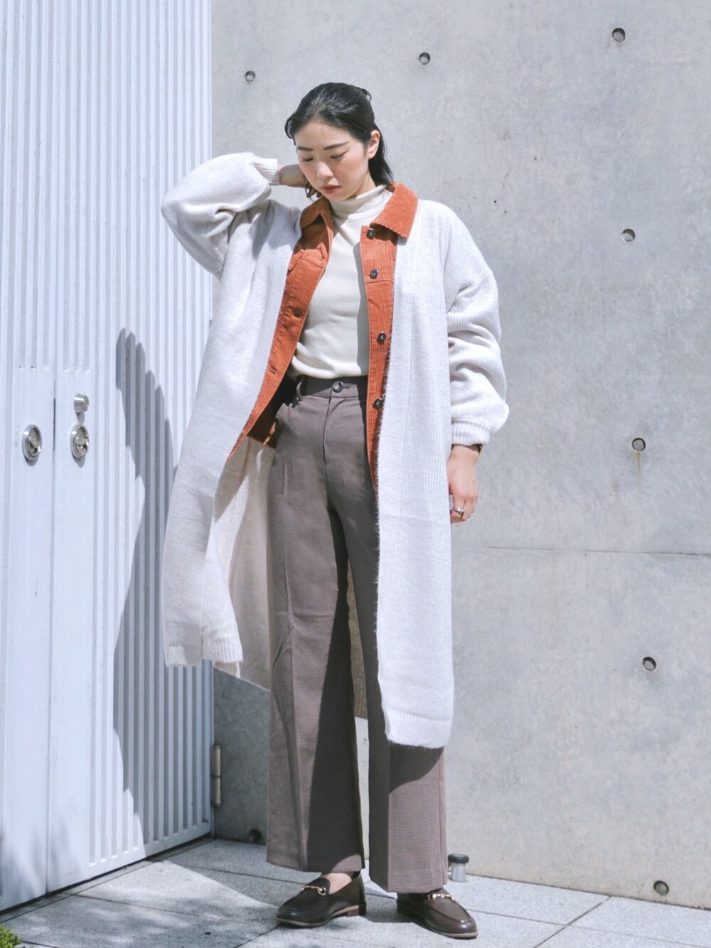 コーデュロイジャケットはカーディガンと合わせれば、冬までつかえて◎ オレンジにチェックパンツ、ローファーでレトロカジュアルに!