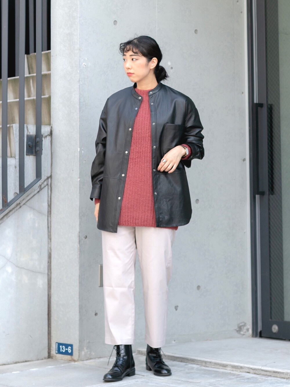クロップド丈のパンツにレンズアップシューズを合わせ、レザーアイテムで ちょっぴり強めカジュアルに*