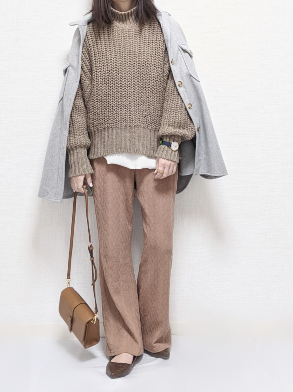 おはようございます。 ご覧いただきましてありがとうございます。 今日は寒いので本当は1枚で着たかった INTER FACTORYさんのハトメトップス +ニットでレイヤードスタイル。 ボトムスはケーブルカットワイドパンツです。ケーブル柄が可愛らしいカットパンツはブラウンを選びました♪ U.S.POLO ASSN.腕時計バイカラー36mmクォーツはホワイト×ネイビーが爽やか✨Dバックルなので付けやすいところもお気に入りです。