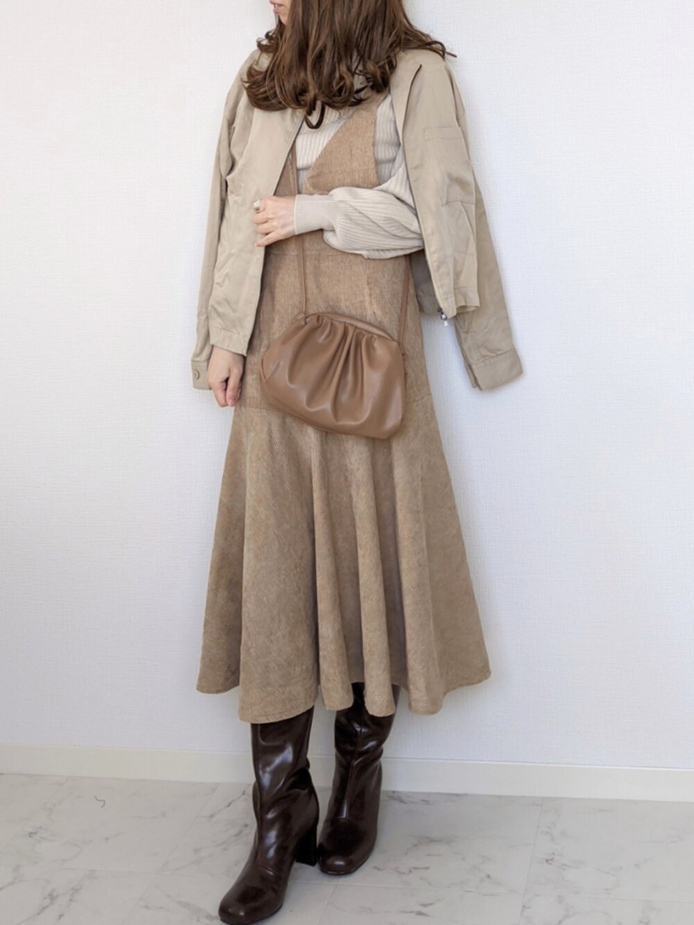 ワンピースコーデ。 DHOLICさんのコーデュロイワンピースは切替えデザインで裾の広がりがかわいい🤍 ap retroさんのボリューム袖がポイントのボトルネックニットと合わせました。 ノーカラーのショートブルゾンをプラスして甘すぎないようにしました。 Instagram➠yume___to 11月もよろしくお願いいたします。