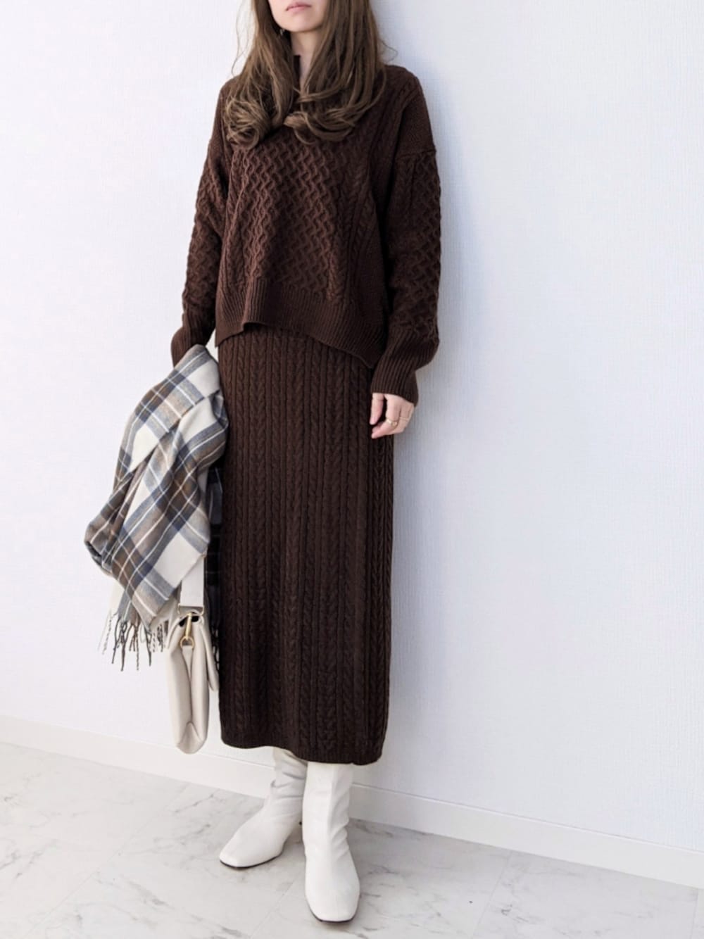 ブラウン×ホワイト。 SUGAR BISKETさんの “ケーブルニットセットアップ” トップスはキーネックで程よい抜け感がかわいい🤍 立体的なケーブル編みのセットアップ。 それぞれ単品でコーディネートも楽しめます♪ 160cmでブラウンのMサイズを着用しております。 首元にストールを巻いたり羽織ったりしてボリュームを持たせてもかわいいですよね⸝⸝ Instagram➠yume___to