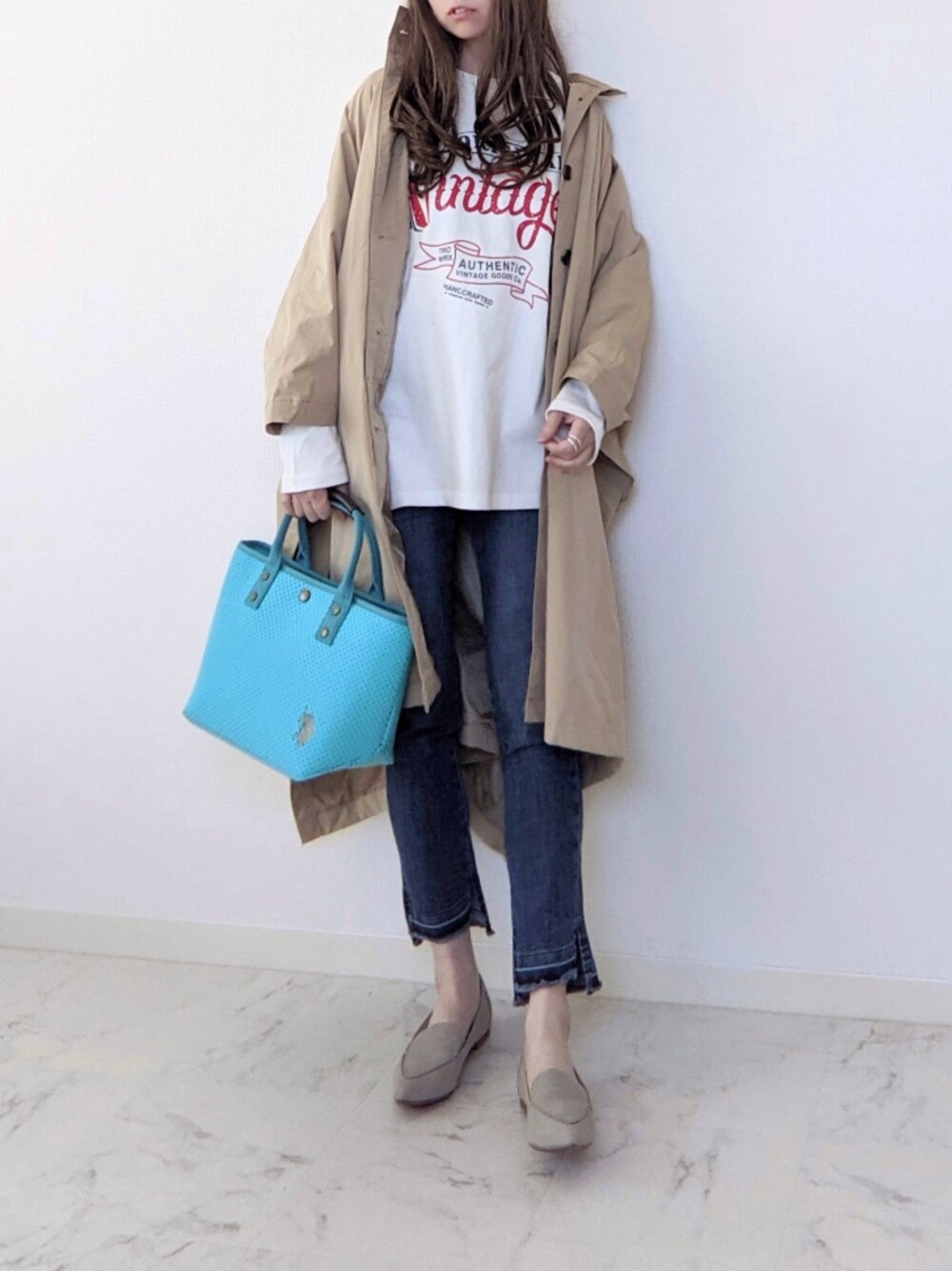 DHOLICさんの ビンテージ風ロゴTシャツと デニムでカジュアルに。 デニムは着丈が2タイプから選べて 私は長めのAタイプにしました☺︎ ストレッチが効いていて履きやすいです♩ アウターは Shelly islandさんのトレンチケープコートを。 今回はサッと羽織ってボタンを開けて着用しました。 前回と雰囲気が変わりますよね❁ 綺麗なブルーのバッグをアクセントに。 Instagram➡yume___to 見てくださってありがとうございます。