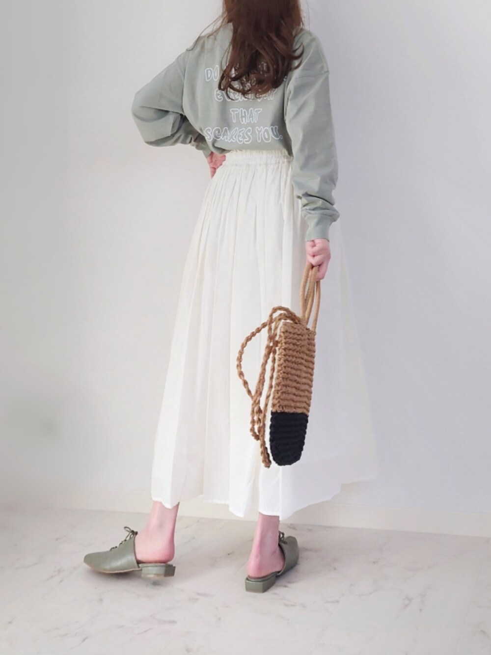 Auntie Rose HolidayさんのTシャツ。 バックに柔らかなフォントの メッセージプリントがかわいい☺︎ グリーンの色味も可愛いです⸝⸝⸝♡ 綿100%のサラッとした素材で ボリュームのある “ a.n.l コットンフレアスカート” 春夏はアイボリーのスカートが必ず履きたく なりますꕤ*.゚ dear.fulの新作はレースアップミュールを購入♩ Instagram yume__to