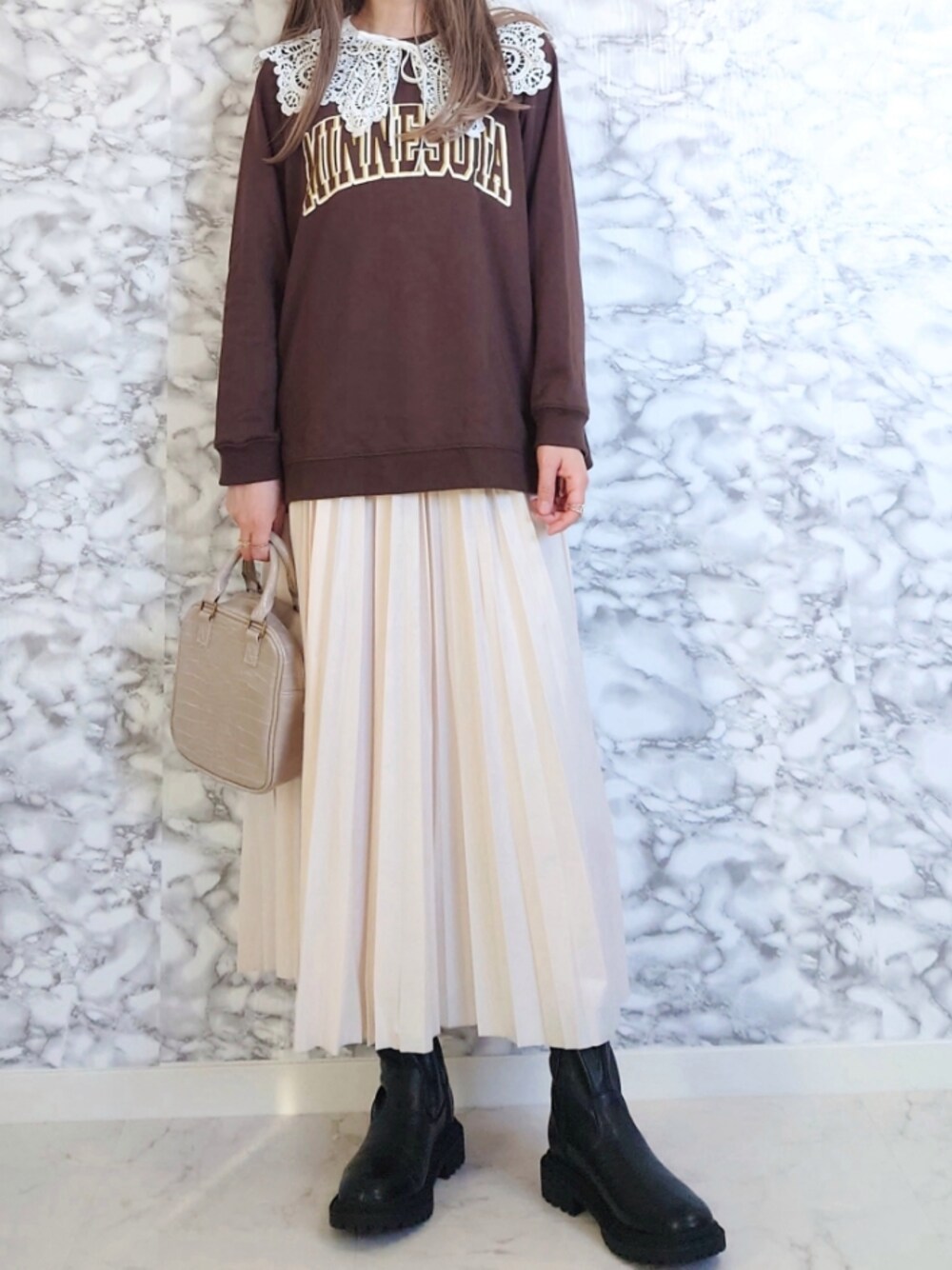 mili an deni ♡♡ ヴィンテージライクなオーバーサイズロゴスウェット。 トレンド感のあるロゴスウェットは ボトムスを選ばずに合わせやすい🙆🏻⸝⋆ サイドスリット入りなので レイヤードスタイルにも◎ つけ襟で雰囲気が変わりますよね🐰 ͛.* · · フェイクレザーのスカート。 程よい光沢感が上品で、プリーツの揺れ感が 綺麗✨ マキシ丈でブーツ、パンプス、スニーカーと 綺麗め、カジュアルどちらも合わせやすいです。 · · item mili an deni ▶️カレッジロゴサイドスリットスウェットPO モカ M ▶️フェイクレザープリーツマキシスカート アイボリー M ZOZOWEEK第2弾のsale中🎵 今日は更にクーポン発行中でお得に⸜❤︎⸝ ︎ ┈┈ ✈︎ Instagram @yume___to
