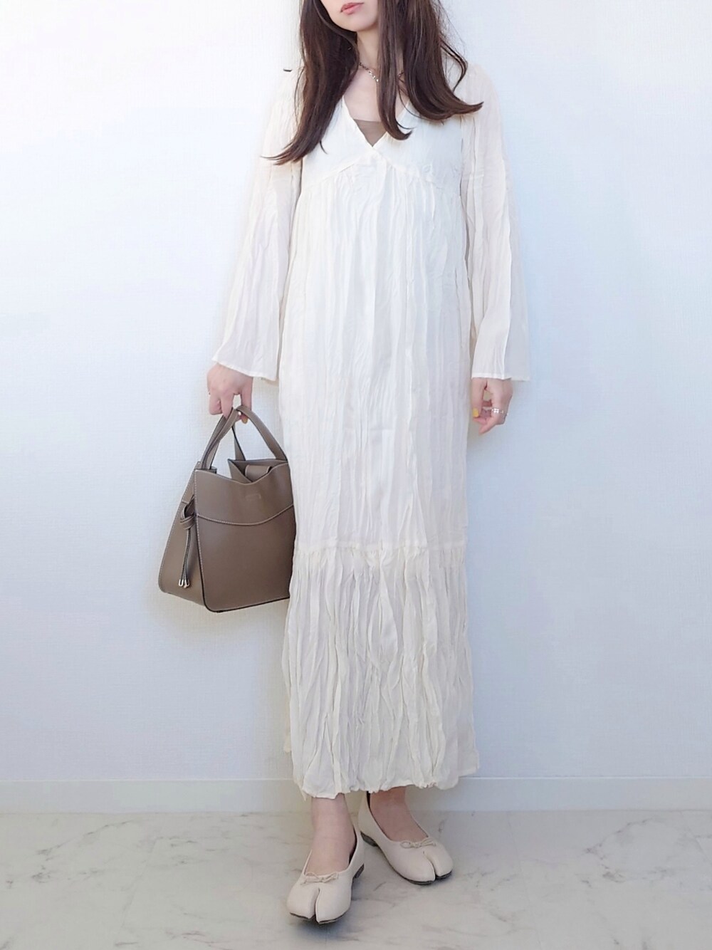 インスタで見て発売を楽しみにしていた apres jour clairのフレアスリーブクリンクルワンピース ´‐ 届いてみたら想像以上にかわいかった⸝⸝⸝⸝♡ 深めのVネックはインナー次第で雰囲気が変わりそう♪フレアスリーブで腕が華奢見えするし、女性らしい印象💓 迷ってアイボリーにしたけどモカもかわいかったですよ𖤐´- Instagram yume___to