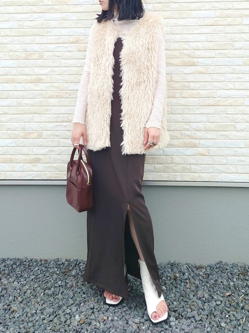 秋服準備🍂 ANGIEのプードルファーベスト♡ 程よいボリュームで毛並みも可愛い💕︎ お尻周りが隠れる丈感で羽織るだけでこなれ感✨ 今日はZOZOで¥1000クーポン対象になっています。 · · ワンピースはap retroのスリットロングキャミワンピース𓂃𓈒𓂂 スリット入りで歩きやすい🙆🏻♀️⭕ シルエットの綺麗なワンピースです🤍 Instagram yume___to